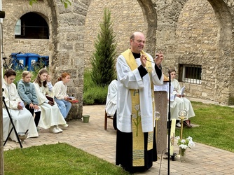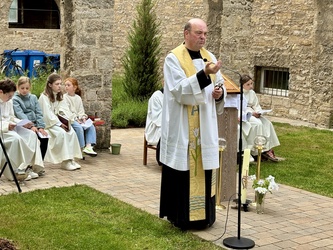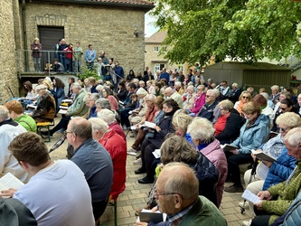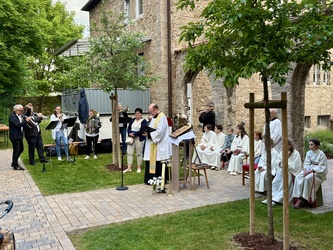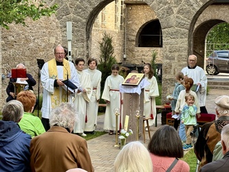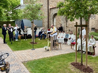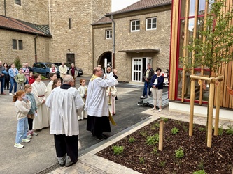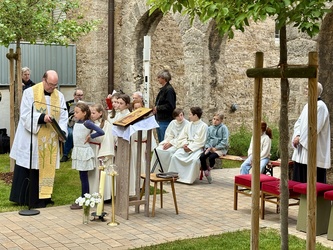 Im Anschluss zog die ganze Gemeinde in den vorderen Teil des Pfarrhofes. Ein neu gepflanzter Baum, für den verstorbenen Diakon Klaus Heßdörfer sollte gesegnet werden.