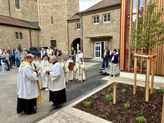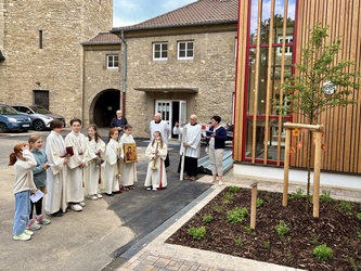 Ein schöner Platz mitten im Pfarrhof für das noch kleine Zierapfelbäumchen. Pfr. Sven Johannsen segnete das Bäumchen. „Möge die Straße … und bis wir uns Wiedersehen, halte Gotte dich fest in seiner Hand…“