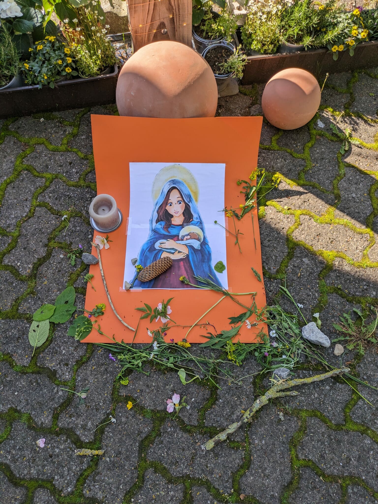 Am Schönstattzentrum angekommen, schmückten die Kinder mit ihren Schätzen ein Marienbild. Wir hörten von Maria und ihrer Rolle als Mutter von Jesus. Gemeinsam sangen, beteten und bastelten wir, passend zum Muttertag, kleine Herzen für alle Mamas.