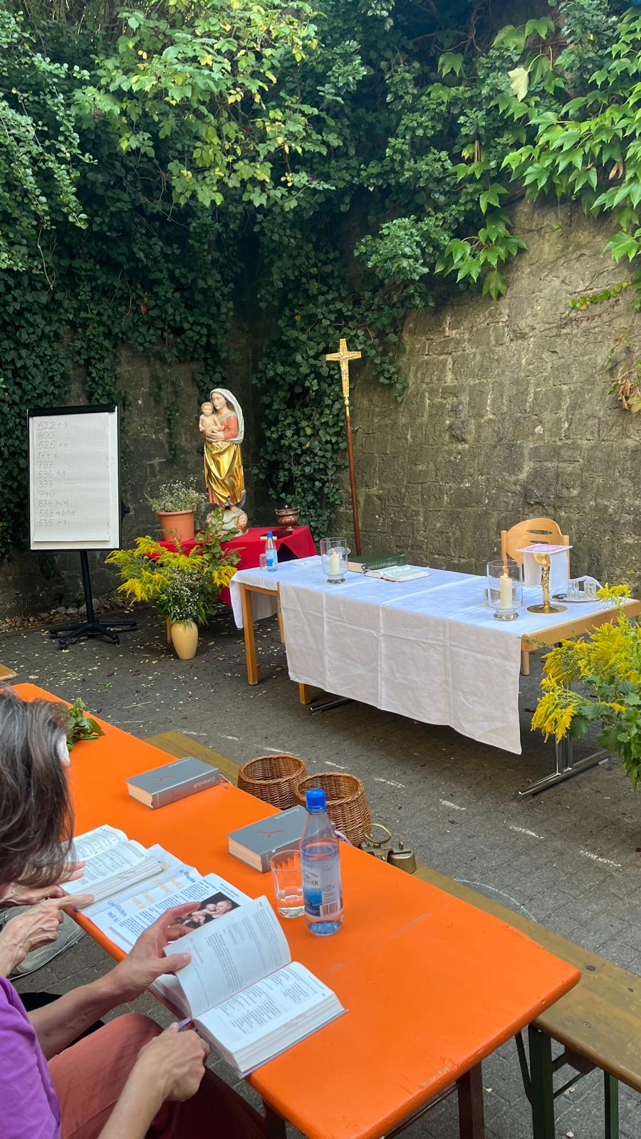 Bange Blicke zum Himmel - Wird es regnen? Leichte Donner rollen über dem ansonsten wolkenlosen Blau. Adi Pecht ist sich sicher: Es wird halten. Die Mühe war nicht umsonst. Die Helfer von St. Barbara hatten Bänke, Altar und Marienfigur im Höfle neben dem Pfarrsaal aufgebaut und eine schöne Atmosphäe geschaffen für die Feier am Abend des Hochfestes Mariä Himmelfahrt. Viele Gottesdienstbesucher kamen, so dass alle Bänke besetzt waren und einige den Gottesdienst im Stehen mitfeiern mussten.