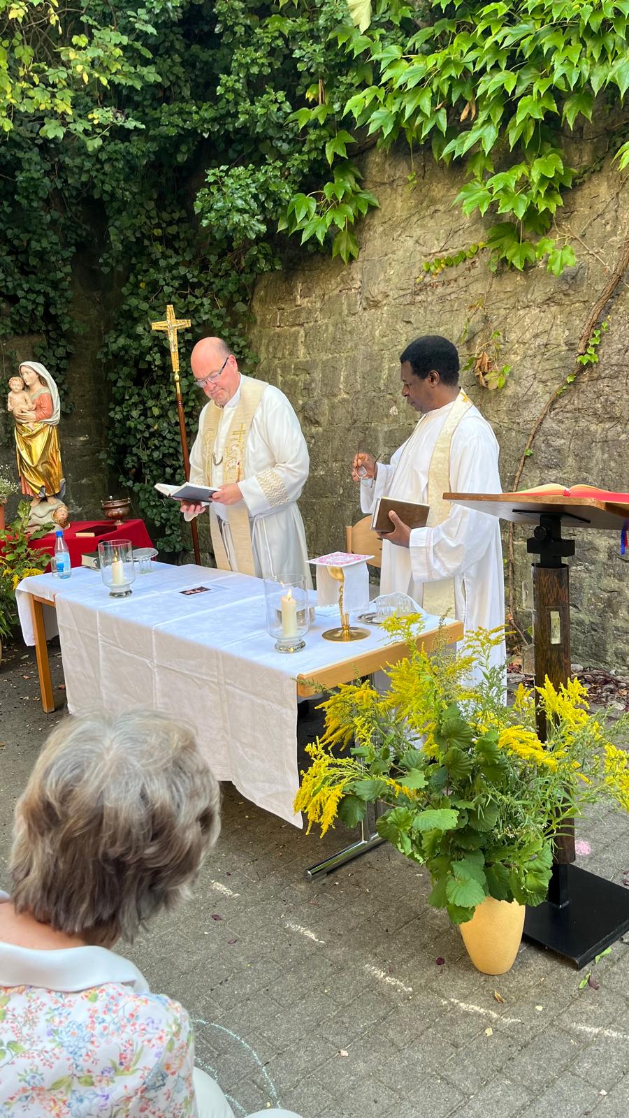 Pfarrer Sven Johannsen und Pfarrer Josef Ozeka gestalteten die Messfeier mit Marienlob, die von Dr. Kemmer musikalisch begleitet wurde. In seiner Predigt nahm der Pfarrer die Frage auf, ob ich mich selbst von außen betrachten möchte? In einem Kunstprojekt in Basel war dies für einige Zeit möglich. In einem anderen Menschen sich selbst entdecken. Wie beliebig ist mein Körper? Das Hochfest Mariä Himmelfahrt spricht davon, wie Gott auf uns schaut. Mit welchen Augen er unser ganzes Leben mit Leib und Seele ansieht. Keine Träne war umsonst, kein Schritt vergeblich, keine Mühe vergessen. Gott bewahrt das Ich. Auch die Menschen, die uns vorausgegangen sind, haben noch eine Geschichte bei Gott, der sie vollendet. Sie kennen uns uns, weil auch wir Teil ihrer Geschichte sind. Dafür steht Maria als Zeichen des Trostes.