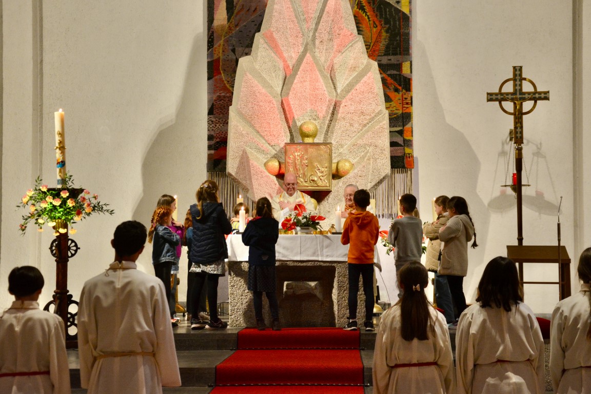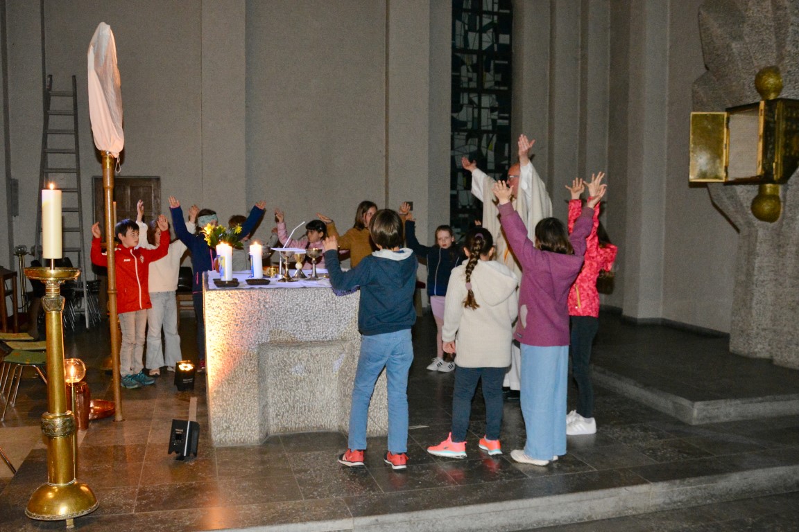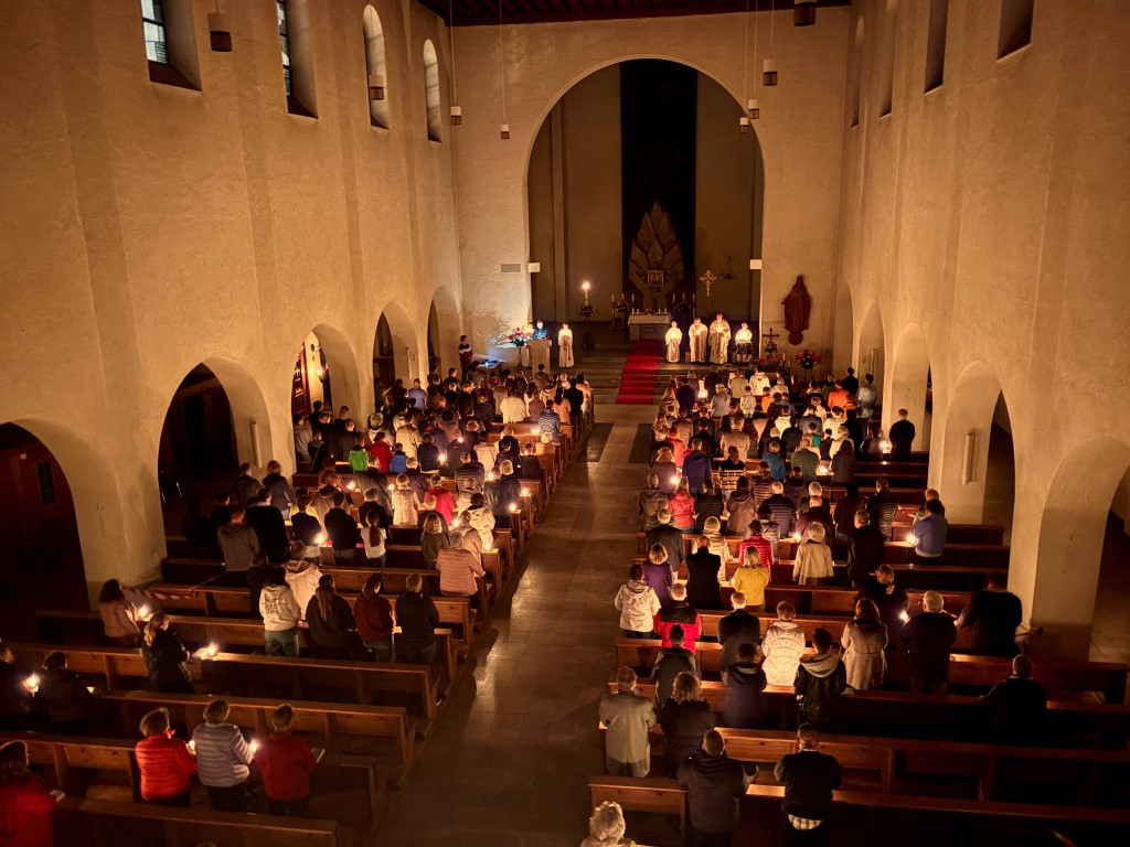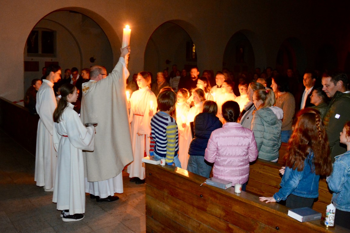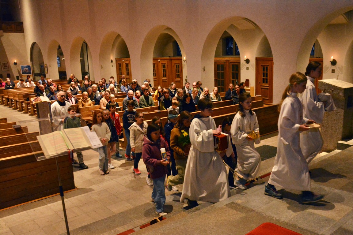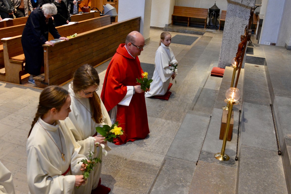 In besonderer Weise waren die Kommunionkinder in die Feiern eingebunden. Mit bunten Palmbuschen führten die Mädchen und Jungen die Prozession vom Hof des Landratsamtes zur Pfarrkirche an. Erstmals seit einigen Jahren fand wieder eine Fußwaschung im Abendmahlsamt des Gründonnerstag statt. Anstelle der Jünger nahmen Kommunionkinder und Ministranten auf den Stühlen vor dem Altar Platz und bekamen von Pfarrer Johannsen die Füße gewaschen. Mit rund 90 Personen jeden Alters ging die Gemeinde am Morgen des Karfreitags den Kreuzweg. Die Kinder begleiteten das Kreuz von Station zu Station mit Fackeln und zeigten die eindrucksvollen Bilder, zu denen das Vorbereitungsteam Meditationen zusammengestellt hatte. In der Liturgie am Nachmittag legten die Mitfeiernden als Zeichen der Verehrung Schnittblumen vor dem Kreuz ab, die später zu einem Ostergarten liebevoll gestaltet wurden. Bereits am Nachmittag des Karsamstags kamen die Kleinsten der Gemeinde und feierten mit Pastoralreferentin Lisa Hippe und Pfarrer Johannsen einen österlichen Gottesdienst mit Feuersegnung und Tauferneuerung. In der Osternacht brachten sich die Kommunionkinder mit einem Lichtertanz zum Lied „Krieger des Lichts“ ein und leiteten über vom dunklen Wortgottesdienst im Dunklen zum Licht, das mit dem Gloria entzündet wurde. Bereits zu den Lesungen illuminierte Max Meder wichtige Orte der Kirche, die die Themen der Lesungen besonders heraushoben: Taufstein, Osterkerze und Tabernakel. Zum Vorspiel des Glorias, das Martin Wetterich eindrucksvoll ausgestaltete, ließ Max das Licht von Bogen zu Bogen in der Kirche wandern.