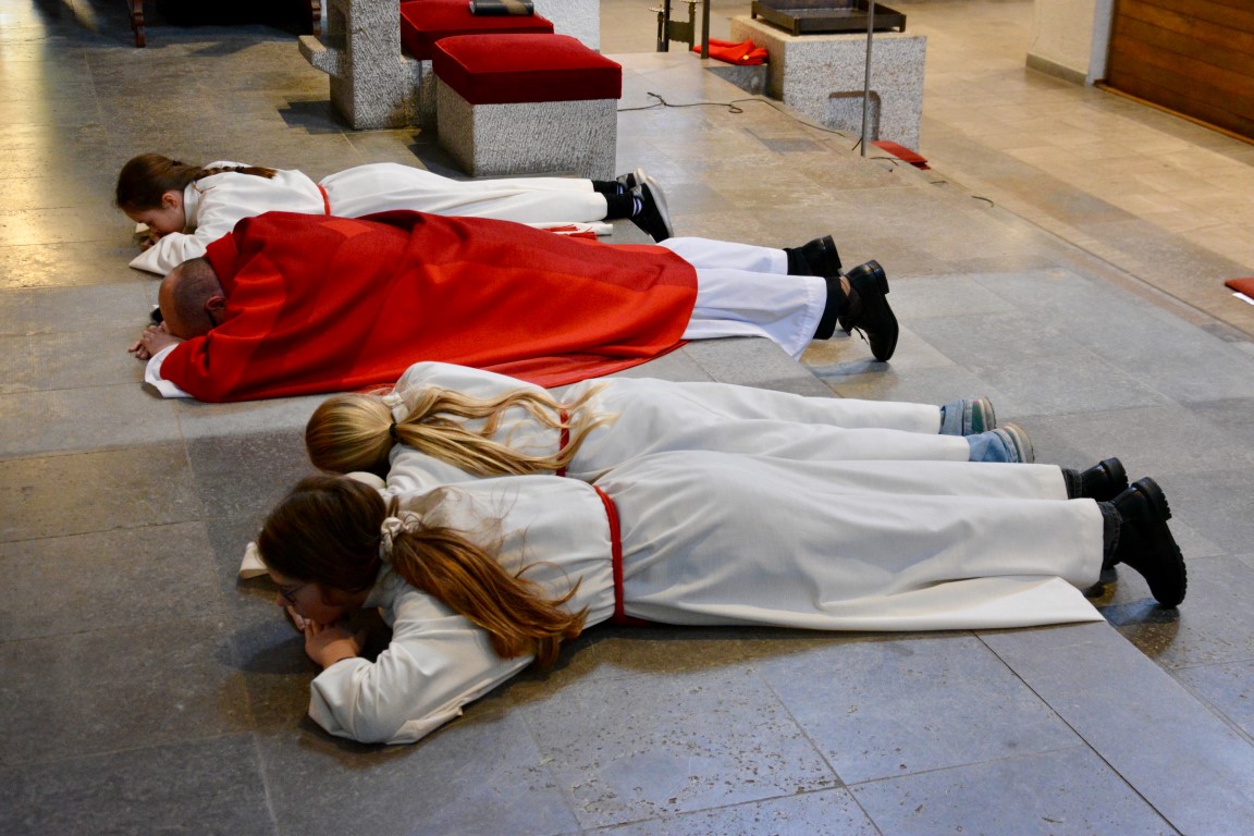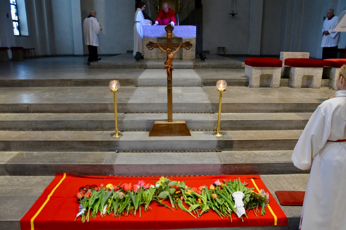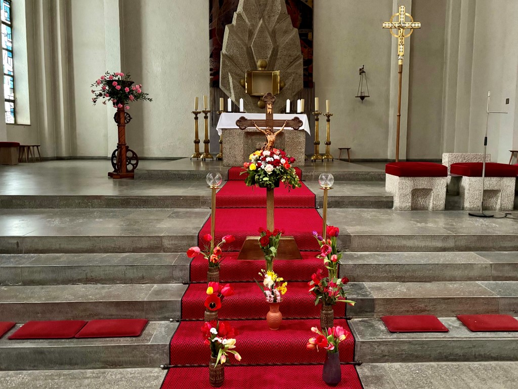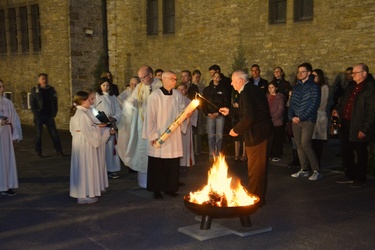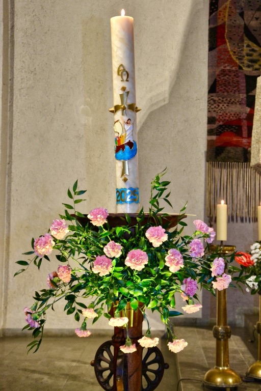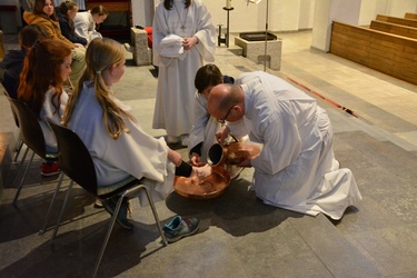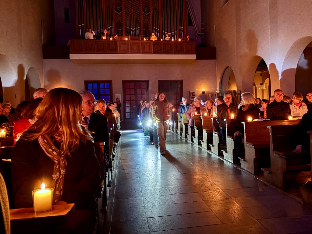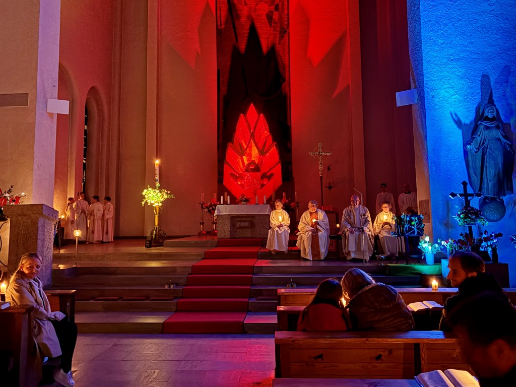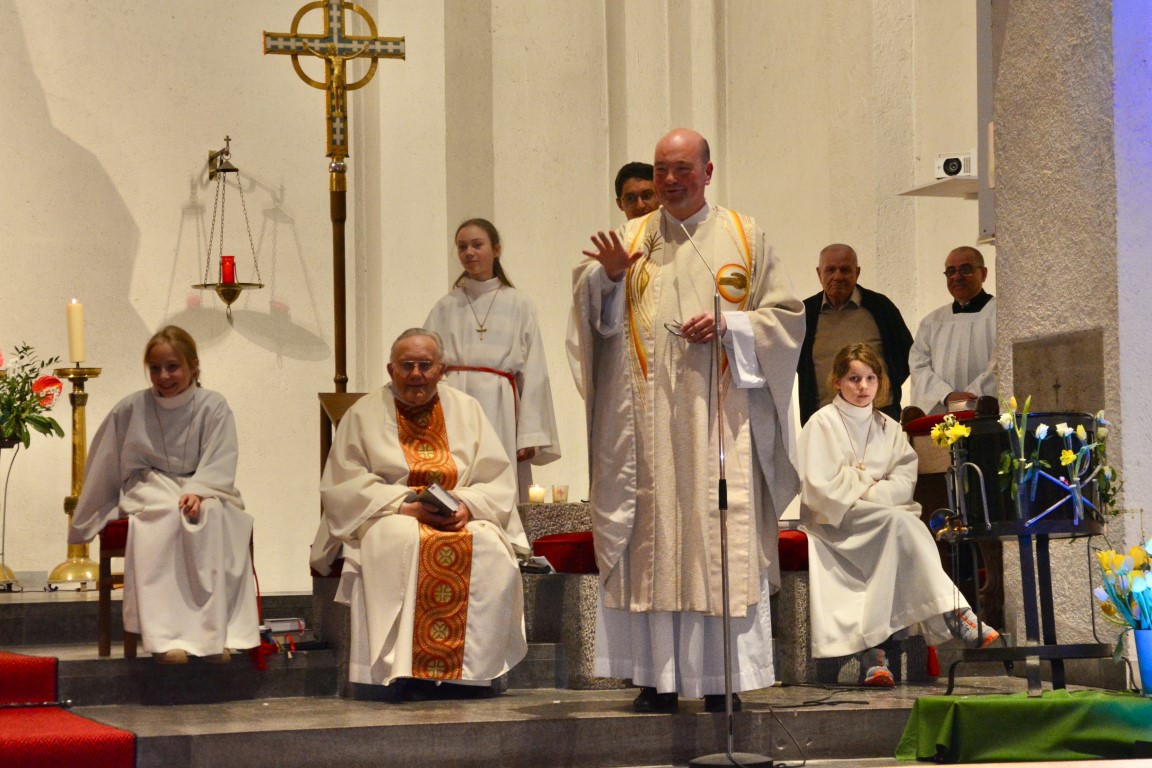 In besonderer Weise waren die Kommunionkinder in die Feiern eingebunden. Mit bunten Palmbuschen führten die Mädchen und Jungen die Prozession vom Hof des Landratsamtes zur Pfarrkirche an. Erstmals seit einigen Jahren fand wieder eine Fußwaschung im Abendmahlsamt des Gründonnerstag statt. Anstelle der Jünger nahmen Kommunionkinder und Ministranten auf den Stühlen vor dem Altar Platz und bekamen von Pfarrer Johannsen die Füße gewaschen. Mit rund 90 Personen jeden Alters ging die Gemeinde am Morgen des Karfreitags den Kreuzweg. Die Kinder begleiteten das Kreuz von Station zu Station mit Fackeln und zeigten die eindrucksvollen Bilder, zu denen das Vorbereitungsteam Meditationen zusammengestellt hatte. In der Liturgie am Nachmittag legten die Mitfeiernden als Zeichen der Verehrung Schnittblumen vor dem Kreuz ab, die später zu einem Ostergarten liebevoll gestaltet wurden. Bereits am Nachmittag des Karsamstags kamen die Kleinsten der Gemeinde und feierten mit Pastoralreferentin Lisa Hippe und Pfarrer Johannsen einen österlichen Gottesdienst mit Feuersegnung und Tauferneuerung. In der Osternacht brachten sich die Kommunionkinder mit einem Lichtertanz zum Lied „Krieger des Lichts“ ein und leiteten über vom dunklen Wortgottesdienst im Dunklen zum Licht, das mit dem Gloria entzündet wurde. Bereits zu den Lesungen illuminierte Max Meder wichtige Orte der Kirche, die die Themen der Lesungen besonders heraushoben: Taufstein, Osterkerze und Tabernakel. Zum Vorspiel des Glorias, das Martin Wetterich eindrucksvoll ausgestaltete, ließ Max das Licht von Bogen zu Bogen in der Kirche wandern.