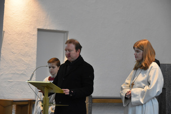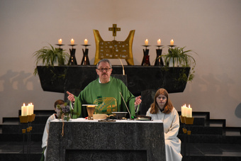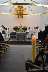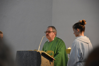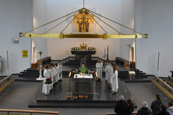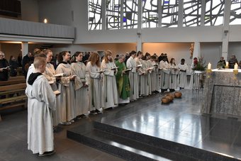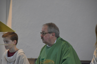 Der Sonntagsgottesdienst wenige Tage nach seinem Geburtstag wurde von der Organistin Erika Heim mit angemessener, festlicher Orgelmusik eröffnet. Die Kirche war mit ca. 120 Christen erfreulich gut besucht, etliche waren gekommen, um Bernd Wagner persönlich zu danken und ihm zu gratulieren. Nahezu 40 Ministrantinnen und Ministranten leisteten den Altardienst an diesem Sonntag, Pater Wagner hat sich in den zehn Jahren intensiv um sie gekümmert, mit ihnen Freizeiten verbracht und insbesondere die LeiterInnen ermuntert, sich um die neuen Mädchen und Jungen zu kümmern. Fast nach jedem Gottesdienst bedankte er sich bei den Ministrantinnen für ihren bereitwilligen Einsatz. Ohne P. Wagner wäre vermutlich die Schar der Ministranten in St. Nikolaus kleiner.