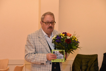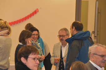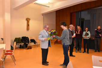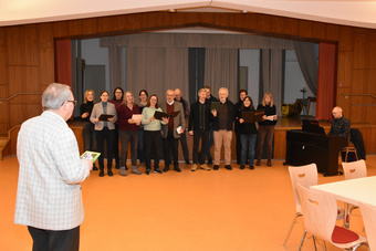 Zum Empfang im Pfarrsaal hatten sich noch weitere Gratulanten auf den Weg gemacht. Der Chor Concino mit seinem Chorleiter Sascha Wehmeier trug musikalisch zur Geburtstagsfeier bei. Tenor Christian Andersen stimmte das berühmte "Halleluja" von Leonard Cohen an, das dänische Volkslied "Die Gläser ergreifet, die Gläser empor" ließ auch andere Festgäste den Refrain mitsingen. Reinhard Kies sprach die Glückwünsche des Chors und vermutlich aller Anwesenden aus. Er erinnerte an den musikalisch begabten P. Bernd; sein Spiel mit der Zitter werden die Musikfreunde leider in Zukunft vermissen. Sein Gesang eines Psalms bei Beerdigungen auf Gerbrunner und Würzburger Friedhöfen habe, so Kies, den Respekt des Priesters vor der Würde der Verstorbenen zum Ausdruck gebracht und Trost gespendet.