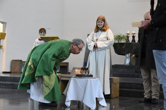 Das Pfarrteam und die Kirchenverwaltung gratulierten nach dem Gottesdienst, Martin Kamp lobte P. Wagner für seine herzliche Art, man spürte die Freundschaft zwischen den beiden. Eine große Begeisterung erfasste die Kirchenbesucher, als Martina Herbst mit einer von ihr gebackenen, prächtigen Geburtstagstorte aus der Sakristei kam und P. Bernd damit offensichtlich überraschte. Nur einmal holte P. Wagner tief Luft, dann waren alle 60 brennenden Kerzen ausgeblasen - großer Beifall in der Kirche.