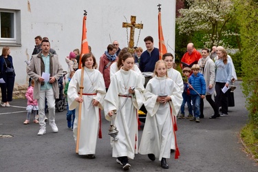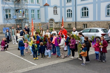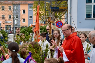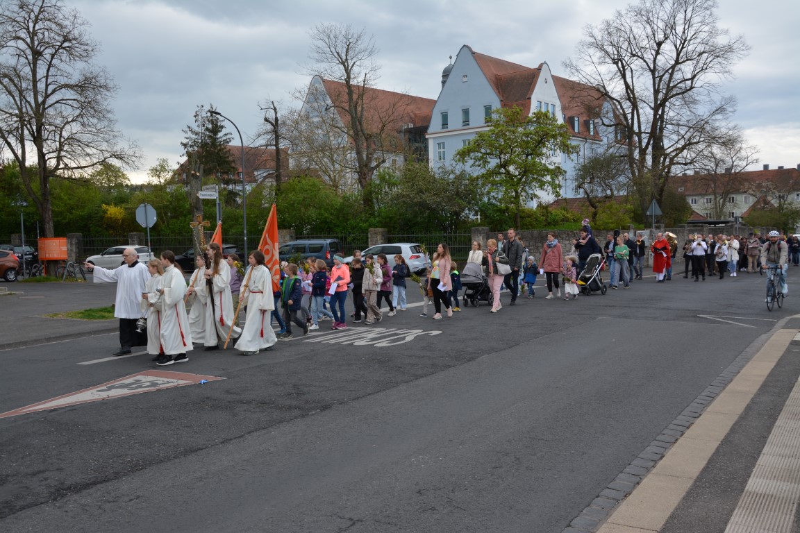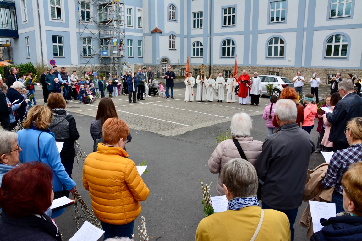 In gewohnter Tradition traf sich die Gemeinde auf dem Gelände des Landratsamtes zur Palmweihe. Gemeinsam zogen alle zum Gottesdienst in die Kirche.