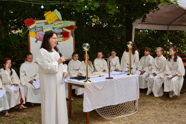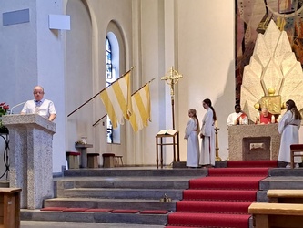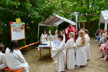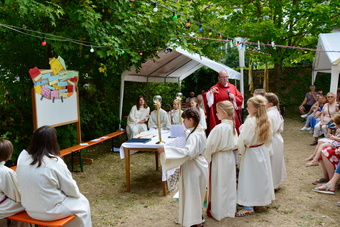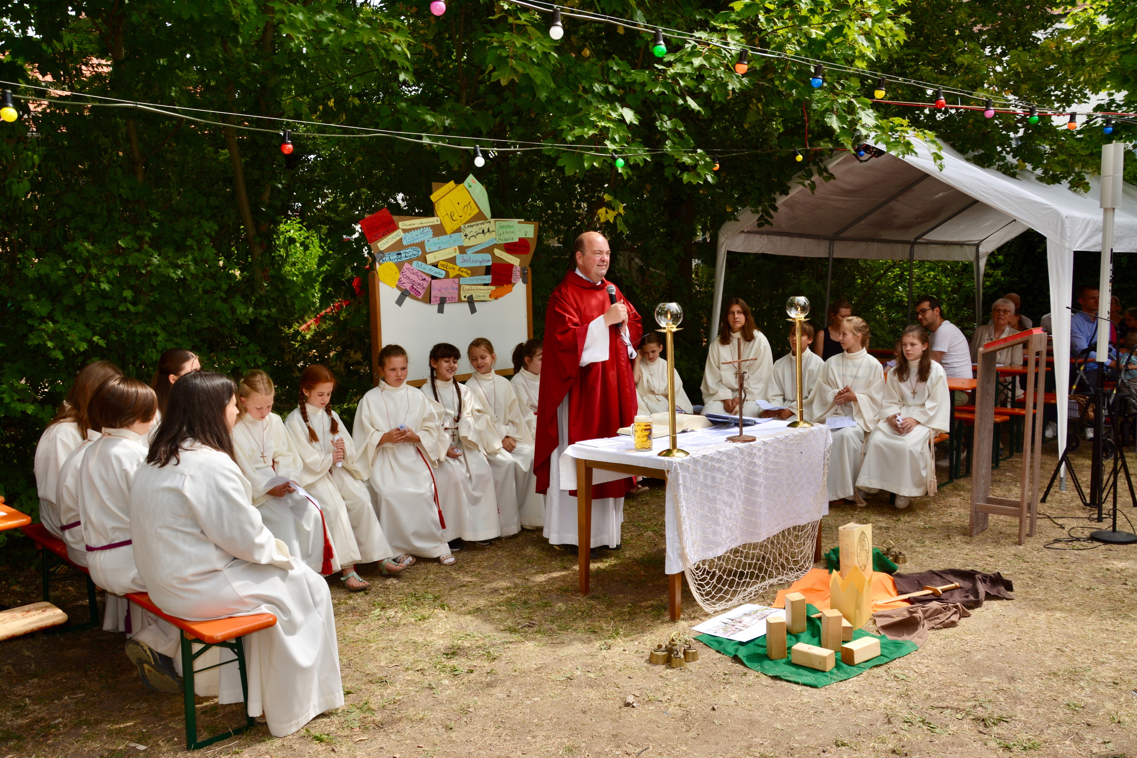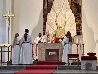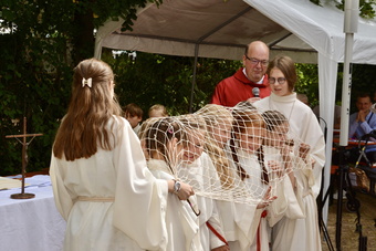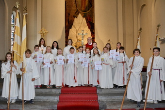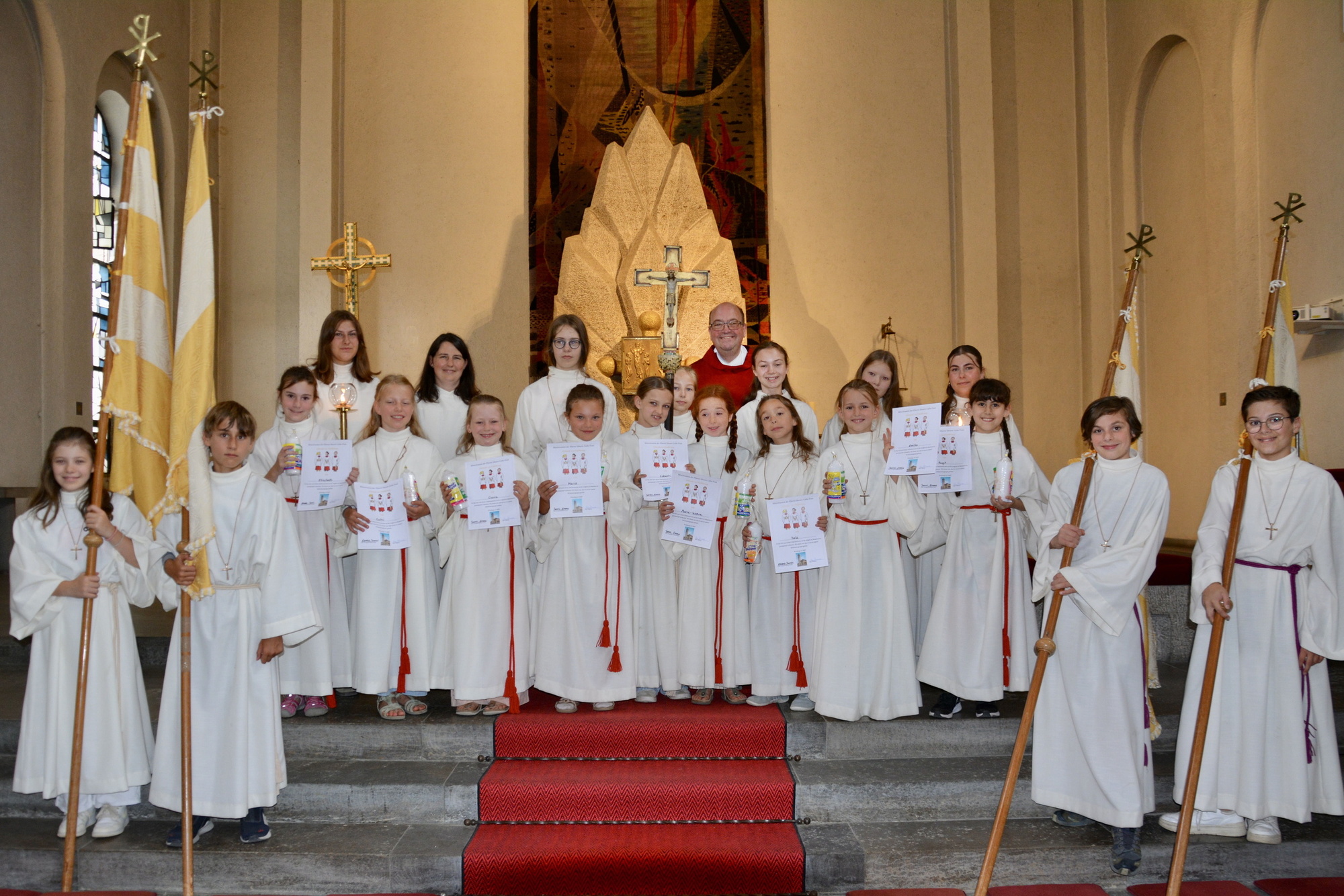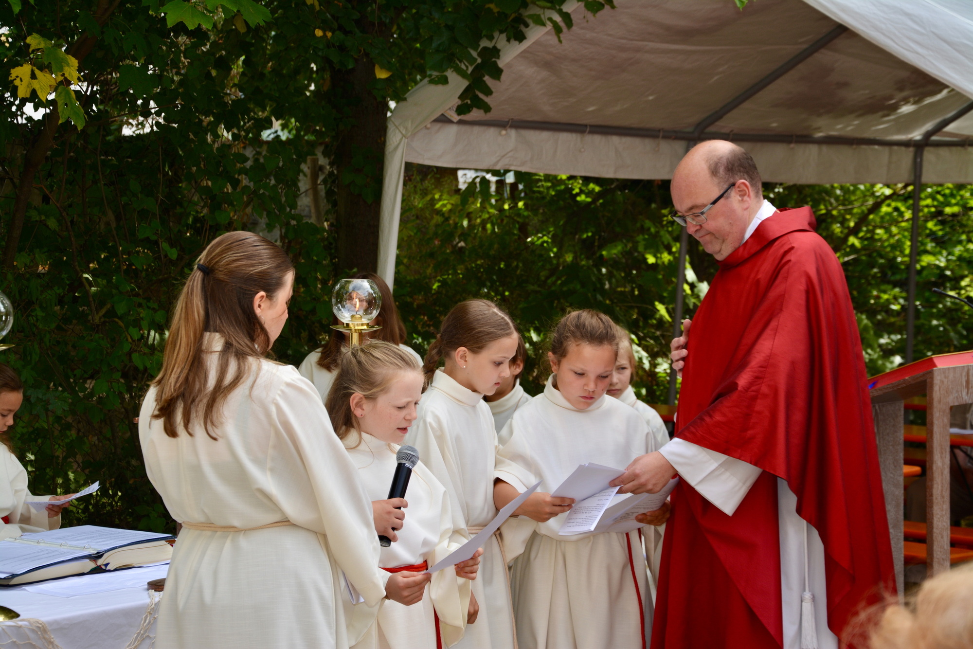 Im Zentrum des sehr kurzweiligen Gottesdienstes zum Hochfest der Frankenapostel stand die Aufnahme von neun Ministrantinnen, welche von ihren Gruppenleiterinnen neben einem Kreuz jeweils eine Kerze und eine Urkunde überreicht bekamen. Eine weitere tritt in den kommenden Wochen ihren Dienst an.