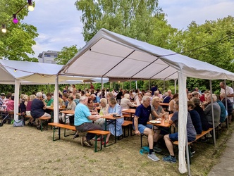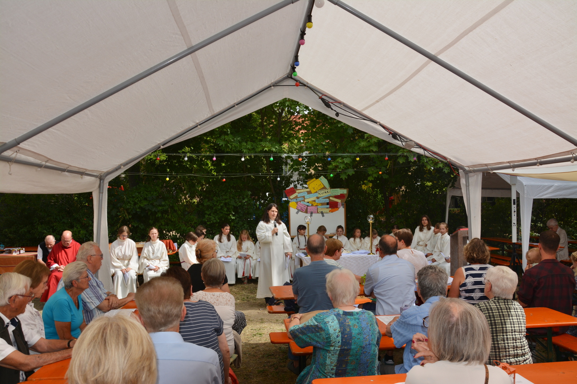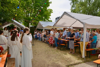 Nach dem Festgottesdienst am Samstagabend, der ganz im Zeichen des diamantenen Priesterjubiläums von Pfarrer Adelbert Benker stand, startete der Festbetrieb bei sommerlichen Temperaturen im Pfarrgarten. Viele Gäste erfreuten sich in gemütlicher Atmosphäre an guten Gesprächen, leckeren Speisen und Getränken sowie zu späterer Stunde an der von der Jugend organisierten Bar.