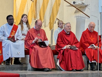 In einem kurzen Anspiel, geleitet von Pfarrer Sven Johannsen, traten sie als Kilian und seine Weggefährten Kolonat und Totnan auf, bis Pastoralreferentin Lisa Hippe die Erzählung über die Frankenapostel und deren Bedeutung für Würzburg mit verschiedenen Symbolen weiter ausführte.