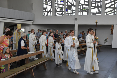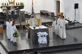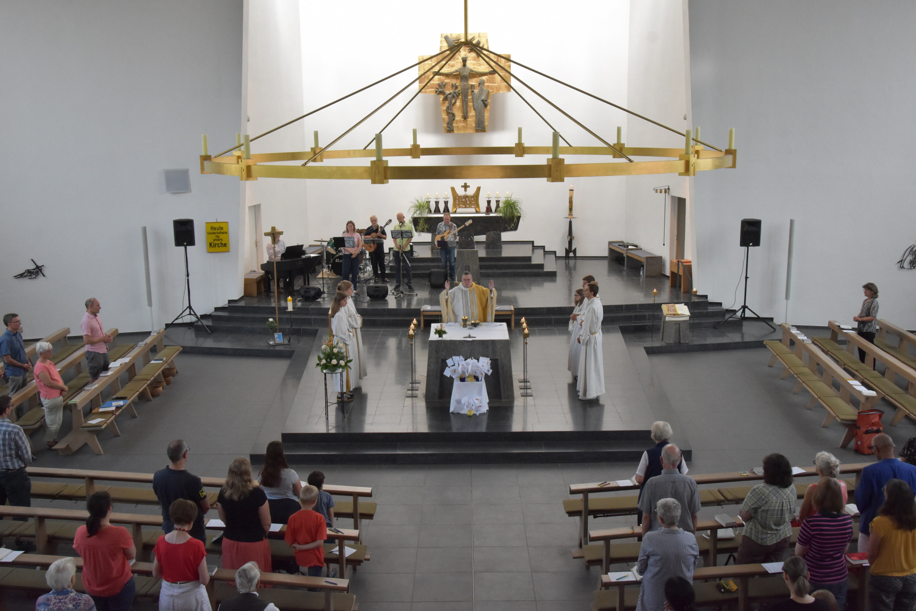 Der zweite Tag des Pfarrfestes startete mit Familiengottesdienst unter dem Motto: „Als Gast und Gastgeber Mahl feiern“. Beim anschließenden Festbetrieb saßen die Besucher beim Mittagessen sowie Kaffee und Kuchen zusammen. Die KJG sorgte wie jedes Jahr mit ihrer Spielstraße und einer Hüpfburg für einen abwechslungsreichen Nachmittag für die Kinder. Ein weiteres Highlight an diesem Tag war die Aufführung des Kindergartens St. Nikolaus, die für ihre mit Freude gesungenen Lieder großen Applaus bekamen. Auch die Diashow über das Zeltlager der KJG zog viele Kinder und Eltern in den Pfarrsaal.