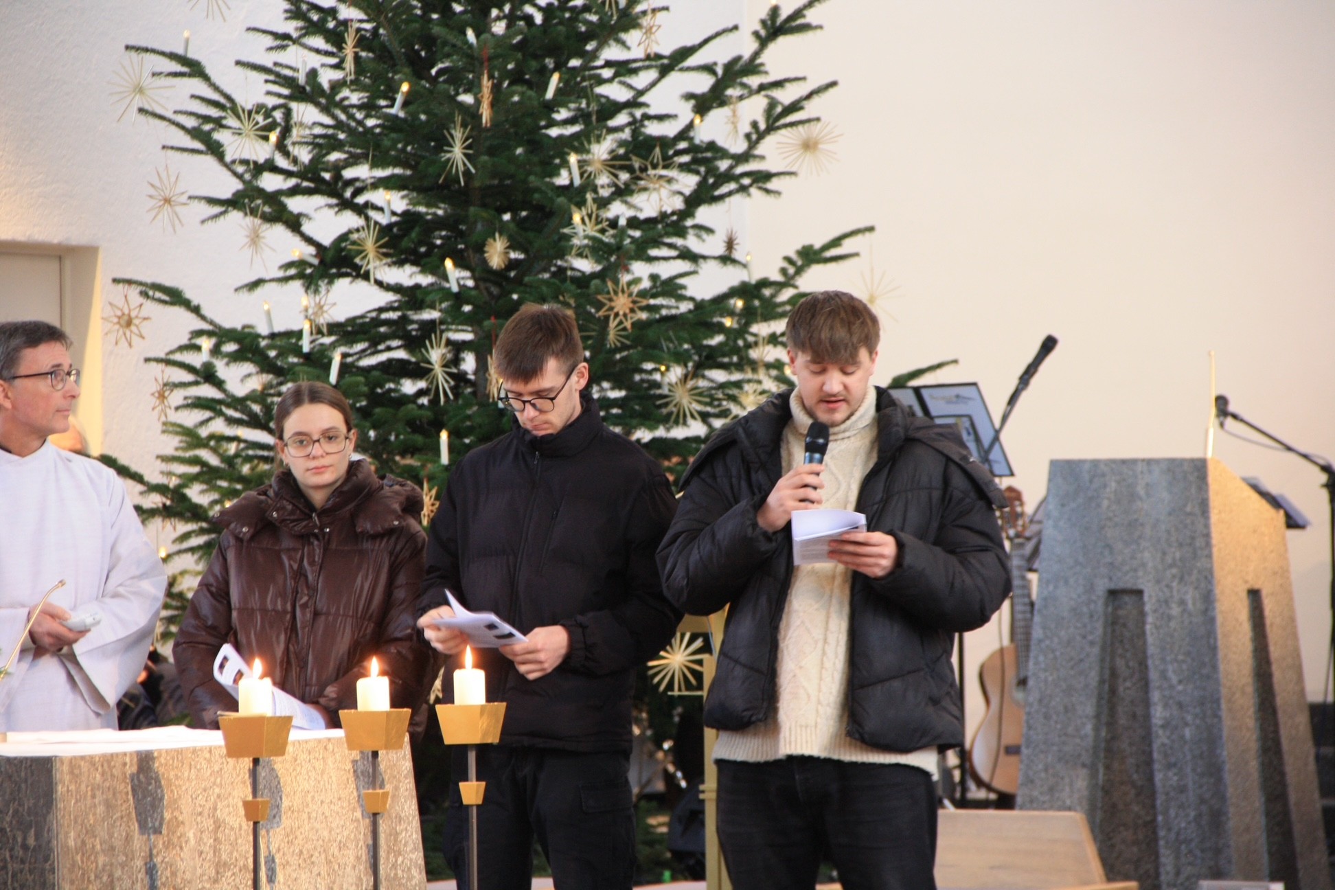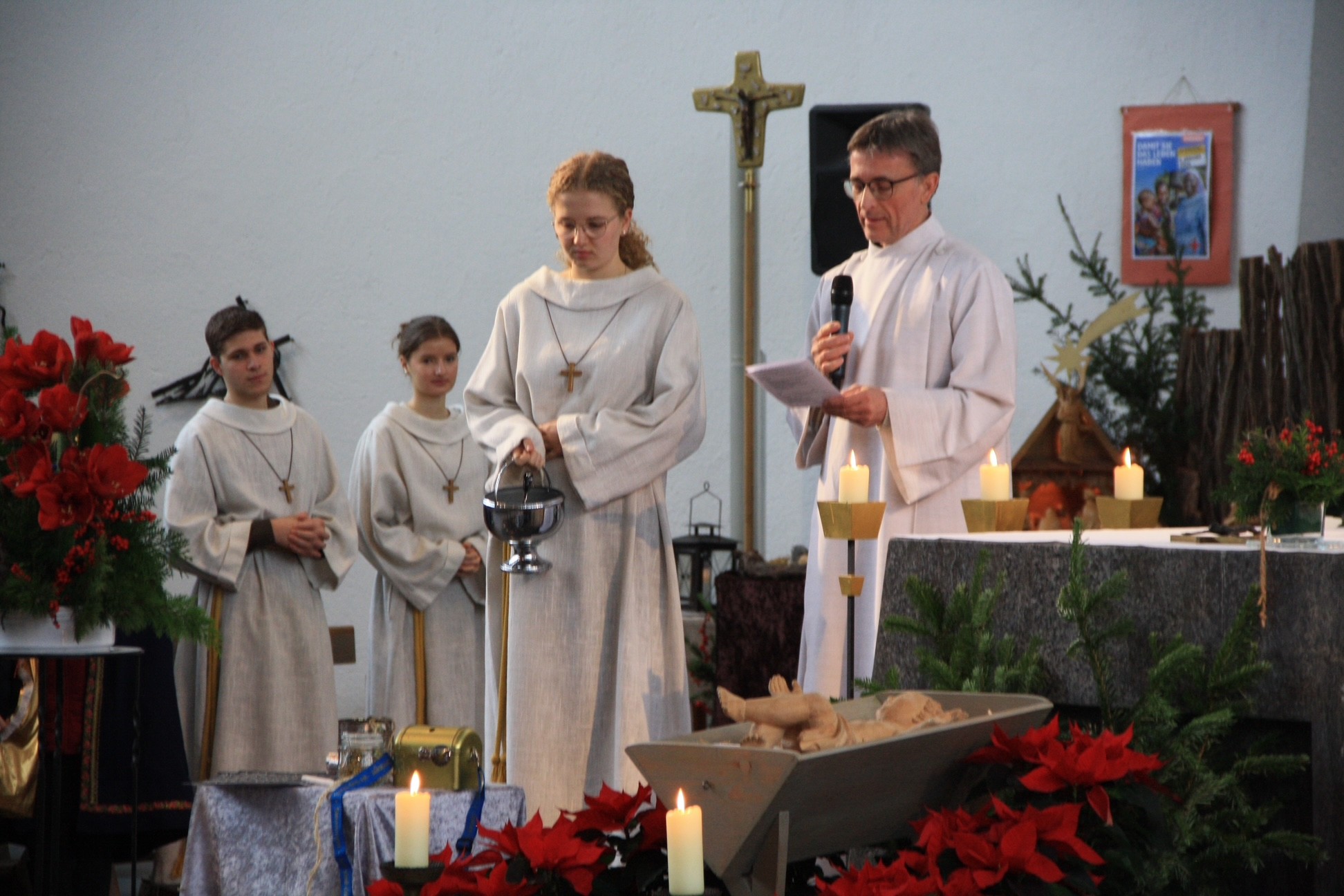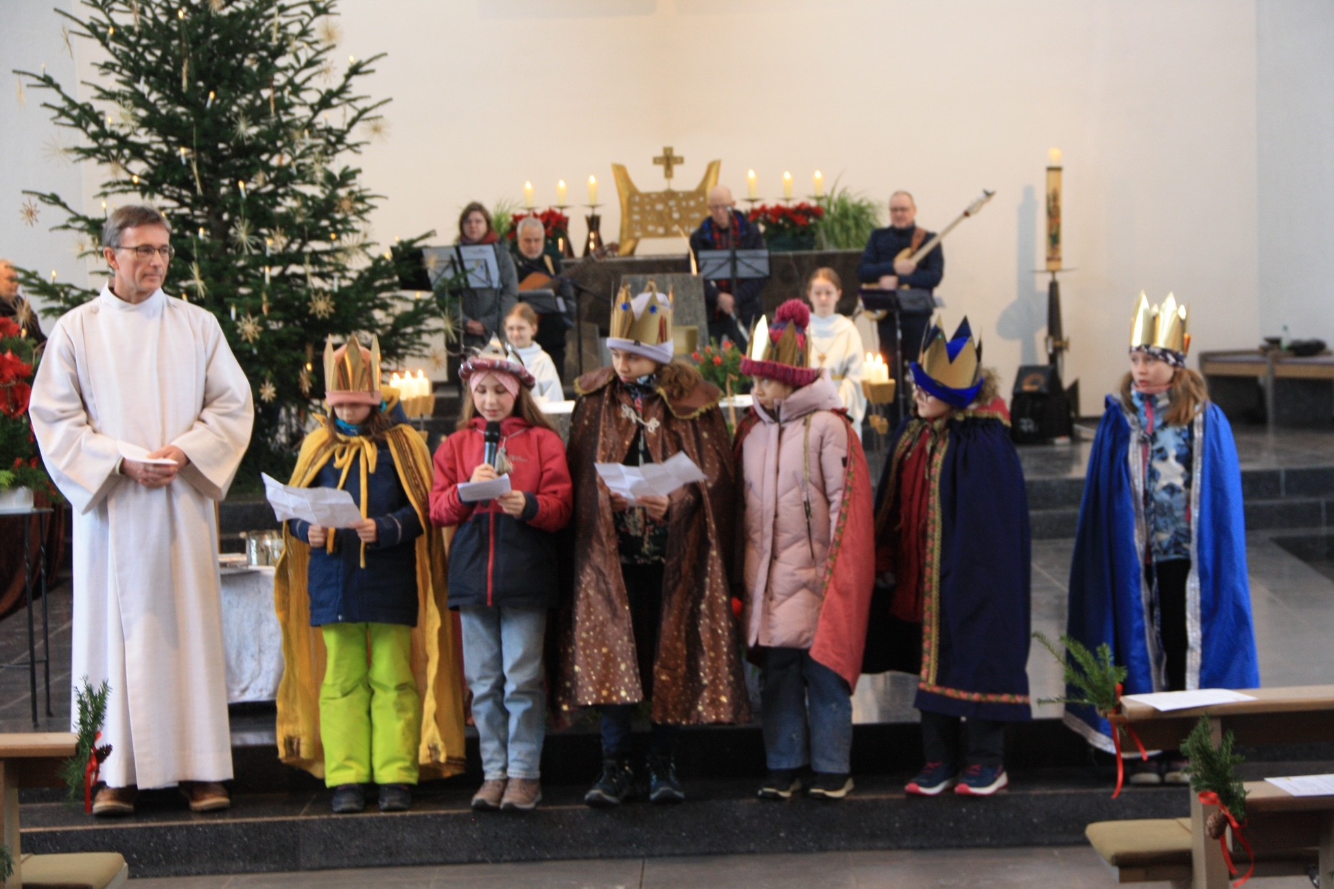 Im festlichen Gottesdienst - gestaltet von den Kindern und Jugendlichen der KjG und musikalisch begleitet von der Kirchenband Soundso - wurde klar, was "Sternsingen gegen Kinderarbeit" bedeutet. Das harte Leben einiger Kinder in Bangladesch, die kaum bezahlte Fabrikarbeit leisten müssen, um ihre Familien zu ernähren, wurde vorgestellt. Mit dem von den Sternsingern gesammelte Geld soll ihnen stattdessen eine gute Schulbildung ermöglicht und eine bessere Zukunft geschenkt werden.