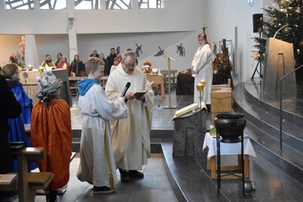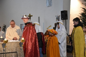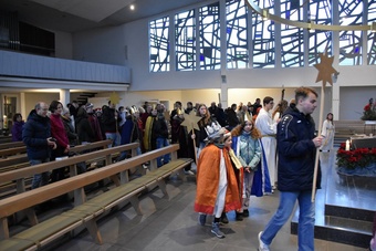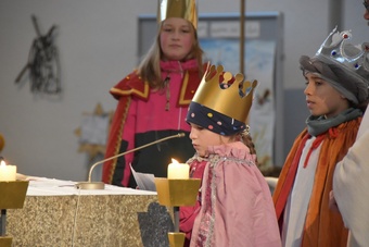Nach dem festlichen Gottesdienst am Morgen in der St. Nikolaus - Kirche machten sich die Sternsinger auf den Weg. Von einer Familie waren alle vier Kinder dabei, von anderen zwei. Das Dreikönigsingen scheint so etwas wie eine Familiensache zu sein. Die jüngeren Kinder kleiden sich königlich, ihre älteren Geschwister, meist Mitglieder der KJG (Katholische junge Gemeinde), begleiten sie, manche von ihnen in der Trainingsjacke des TSV Gerbrunn. Warum nicht? Familie, Freundschaft, Kirche, Sportverein – die Kinder und Jugendlichen erleben auf diese Weise ganz lebendig ihre Heimat. Zugleich wird ihnen der Blick geöffnet für benachteiligte und Not leidende Kinder in Afrika, Lateinamerika, Asien, Ozeanien und Osteuropa.