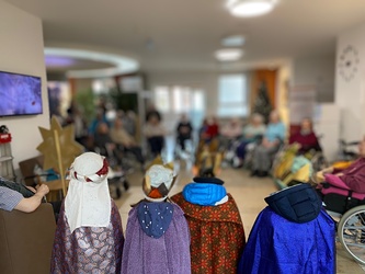 Zum ersten Mal seit Langem gab es wieder ein gemeinsames Mittagessen im Pfarrsaal, welches von der Familie Budig der Gaststätte MainHaus gekocht wurde. Frisch gestärkt und aufgewärmt konnte es nachmittags weitergehen. Wie im letzten Jahr brachten die Sternsinger den Segen 20*C+M+B+24 auch dem Pflegeheim und dem Wohnheim Miravilla, wo sie von den BewohnerInnen freudig begrüßt wurden.