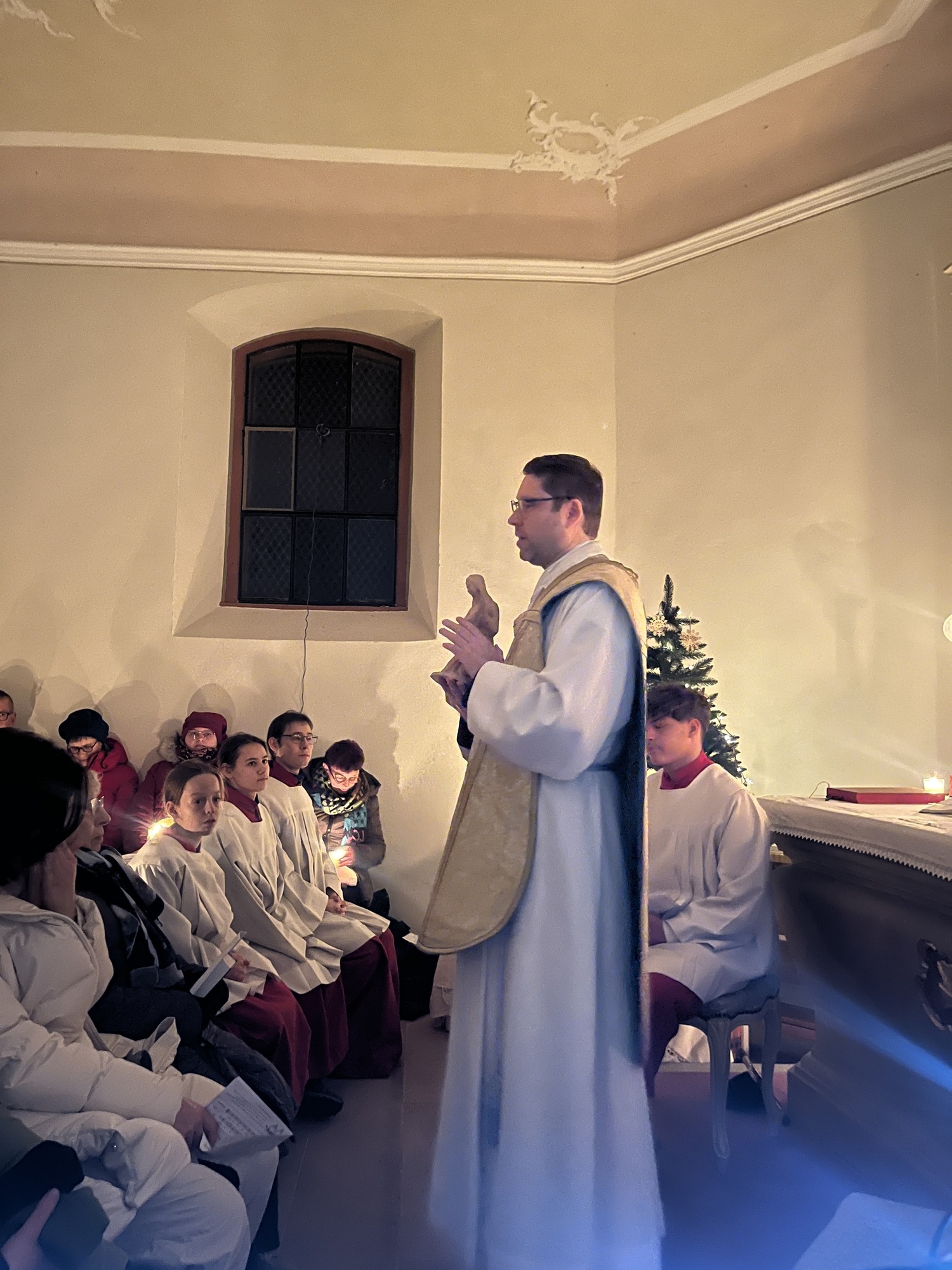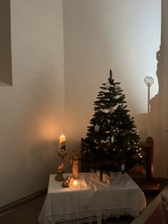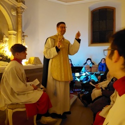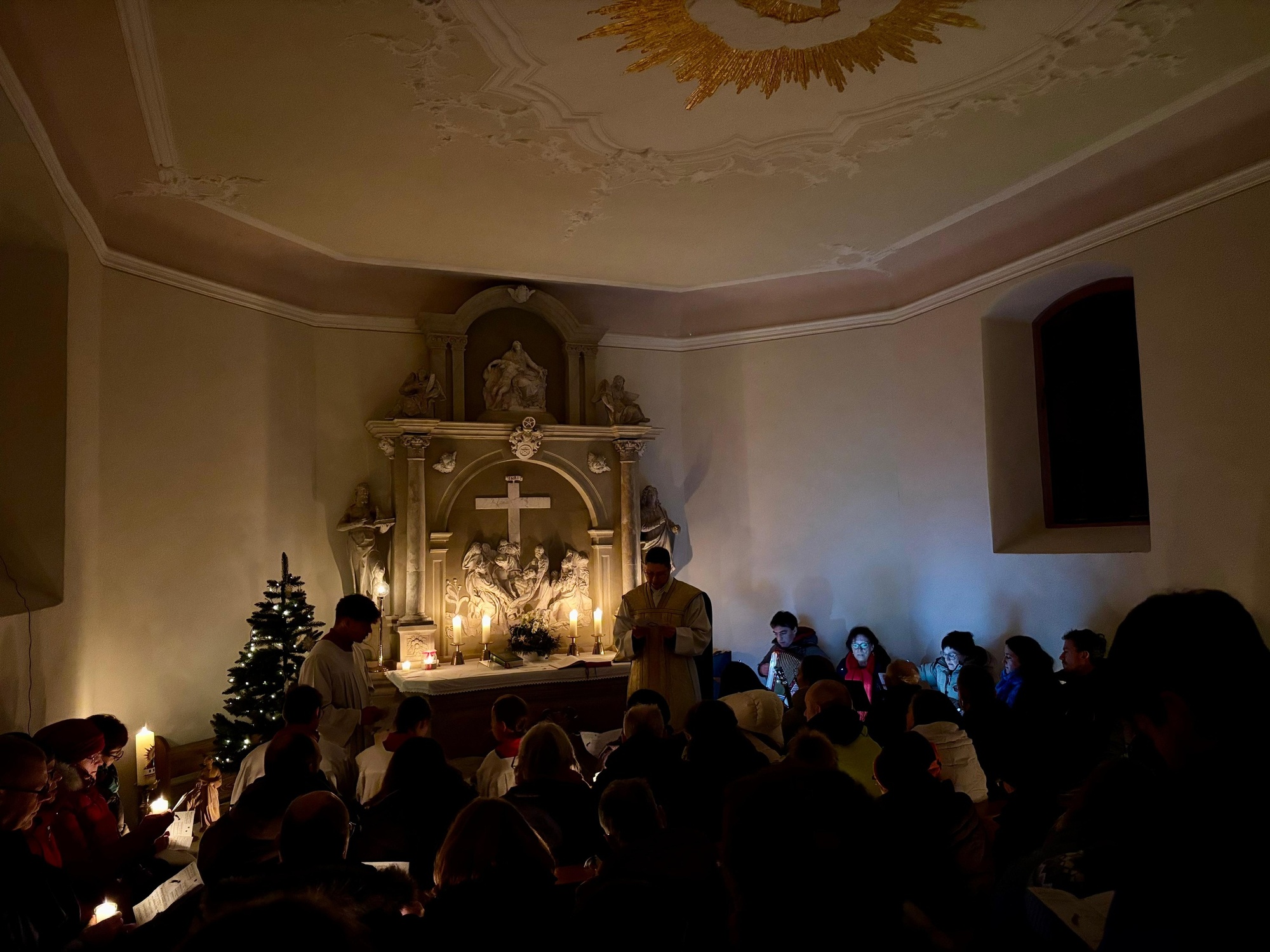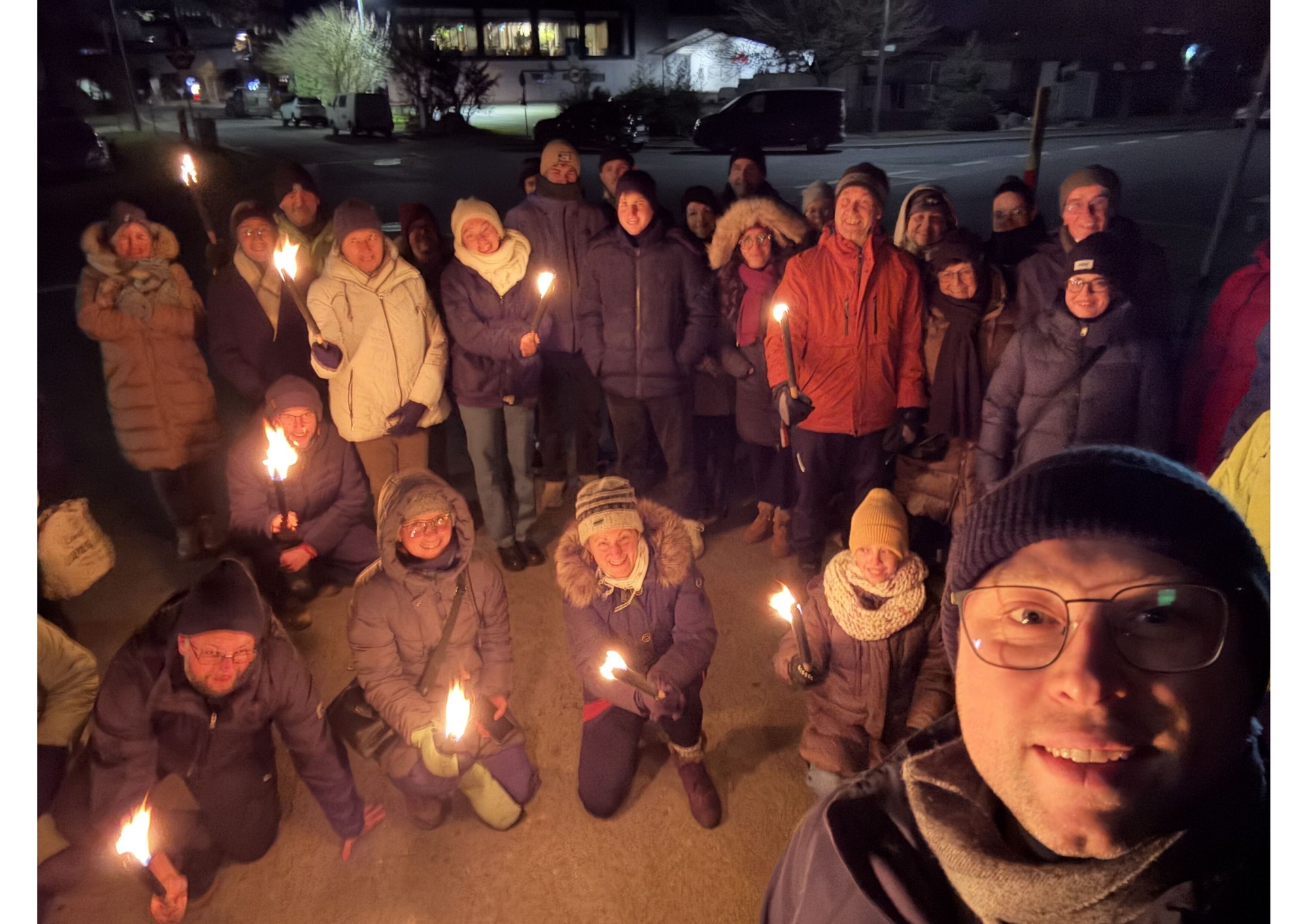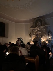 Bereits im Herbst entstand die Idee von Pfr. Manuel Thomas, am Heilig Abend, die "stille Nacht" im Käppele zu feiern. Es bedurfte einiger Vorbereitungen und Kreativität, die mit vielen fleißigen Helfern gut zu meistern waren. Da das Käppele für sehr viele Rottendorfer ein ganz besonderer Ort ist, zeigte es sich einmal mehr für die Mitternachtsmette sehr würdevoll im Kerzenschein Christmette zu feiern. Die Jugend und weitere Besucher zogen mit Manuel Thomas von Fackeln begleitet zum Gottesdienst. Der alleinige Kerzenschein und die musikalische Gestaltung gaben der Mette eine sehr persönliche Note.