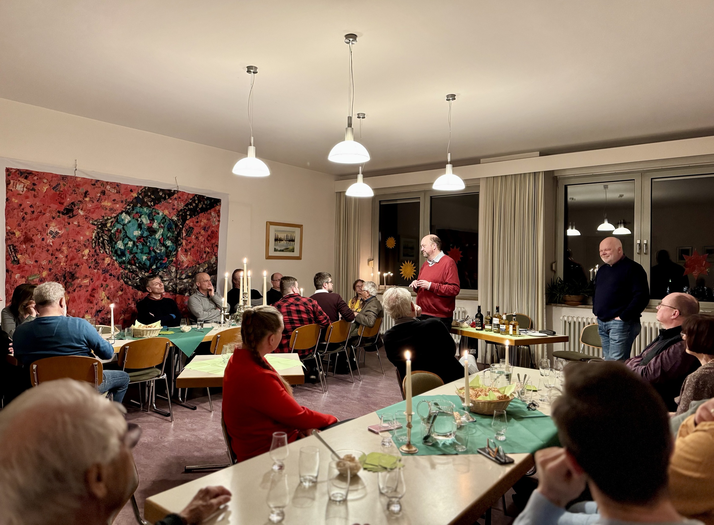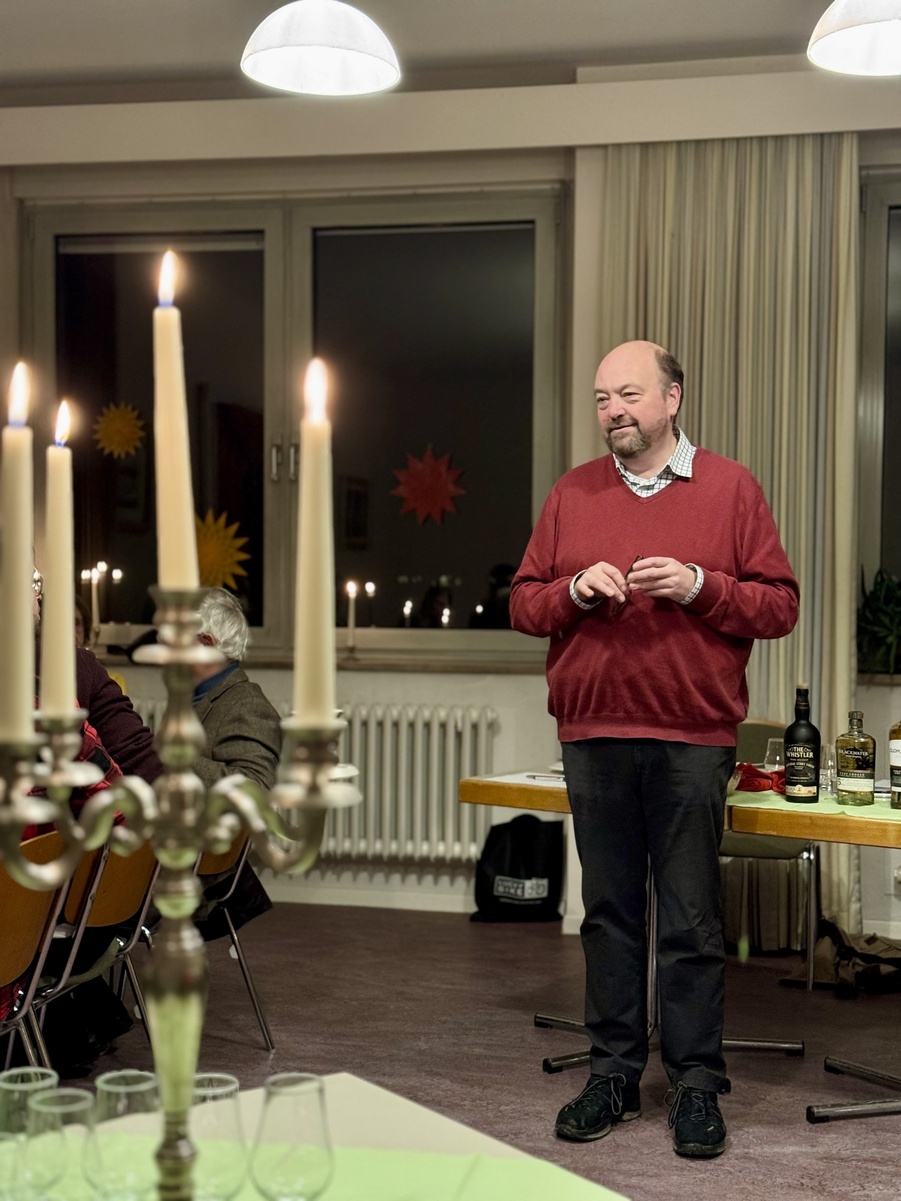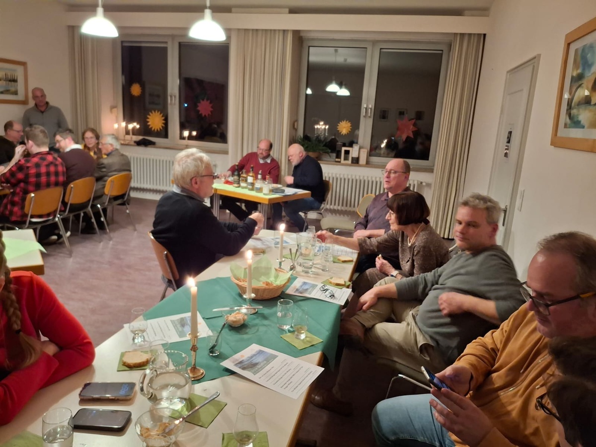 Matthias Fleckenstein und Pfarrer Sven Johannsen spannten einen weiten Bogen vom heiligen Patrick und den Anfängen des Whiskeybrennens bei den altirischen Mönchen bis zu den modernen, kleinen Destillerien, die den irischen Whiskey so einzigartig und abwechslungsreich machen und versuchen, die alte Tradition des Brennens mit einer Rückbesinnung auf regionale Zutaten und überlieferte Rezepturen in die Zukunft zu führen. Geschichten über kupferne Pot Stills und den Anteil der Engel am Inhalt des Whiskeyfasses, das in der salzigen Luft der Atlantikküste reift, wurden von Proben aus unterschiedlichen Regionen Irlands und selbstgebackenem Sodabrot begleitet. Natürlich durften auch Informationen über landschaftliche Highlights einer Irlandreise nicht fehlen, und es gab die tröstliche Versicherung, dass wir uns als Christen glücklich schätzen können, da uns der Genuss von Alkohol nicht verwehrt ist: „Können denn die Hochzeitsgäste fasten, solange der Bräutigam bei ihnen ist?“ so fragt Jesus selbst.
