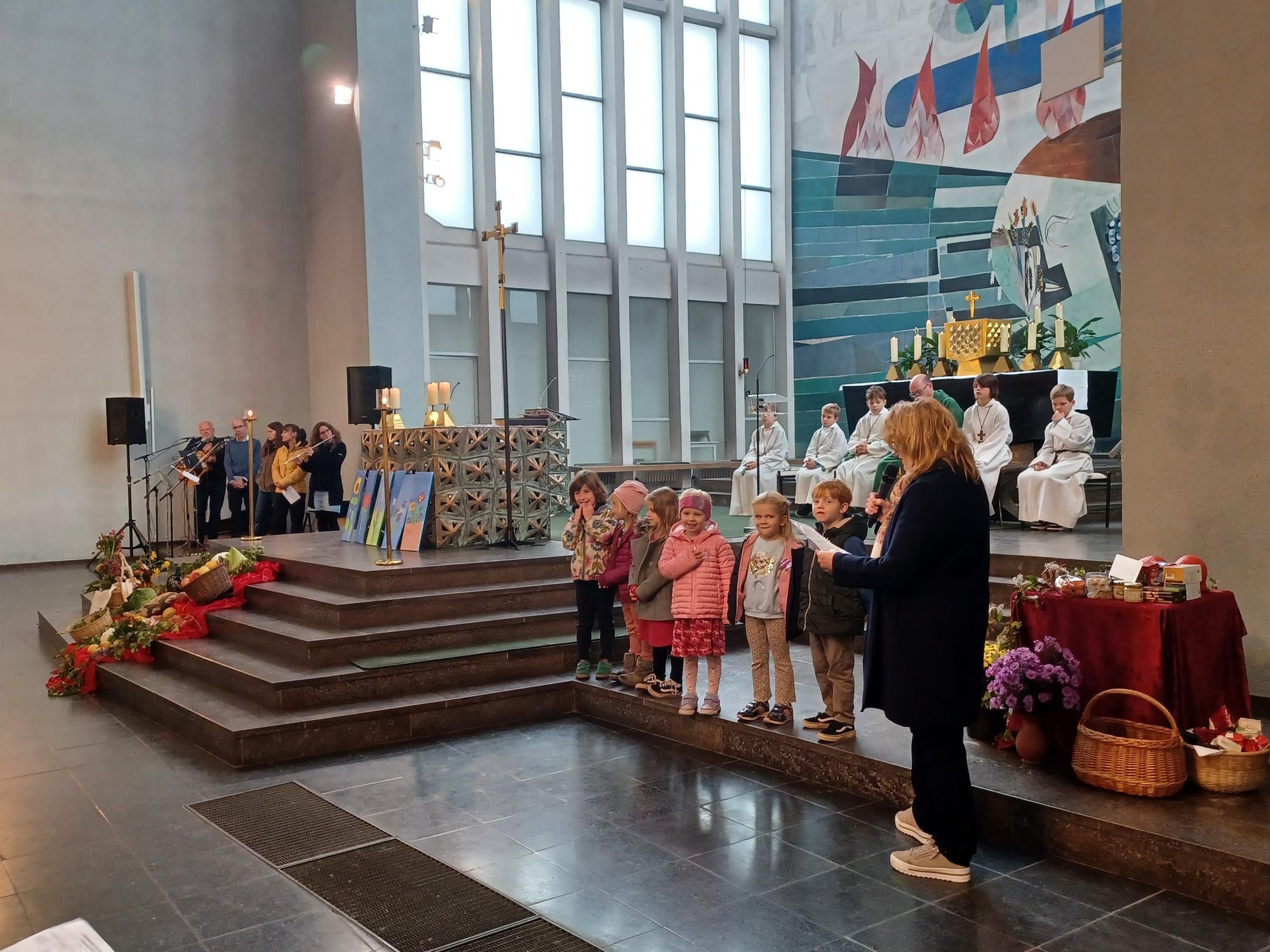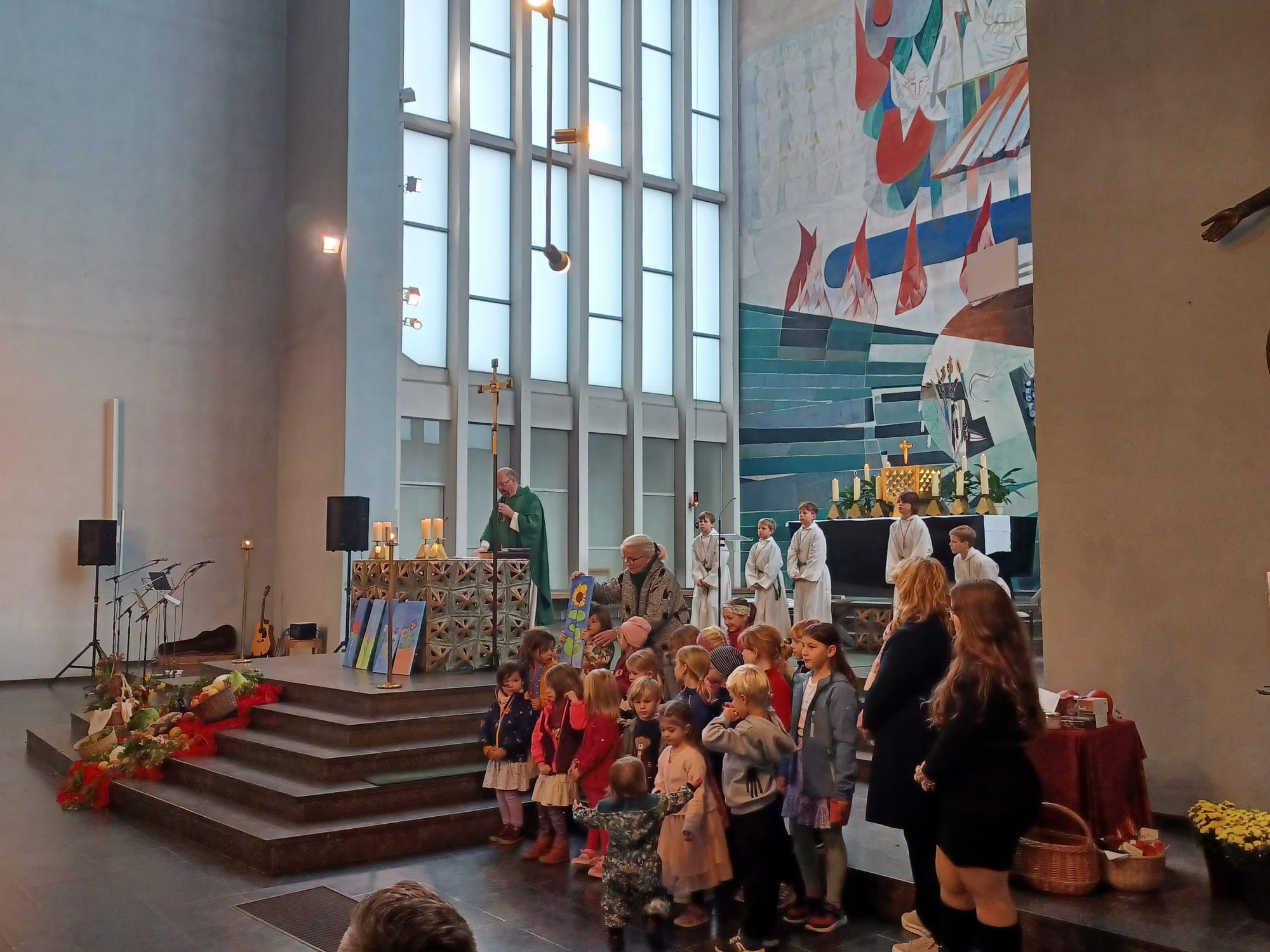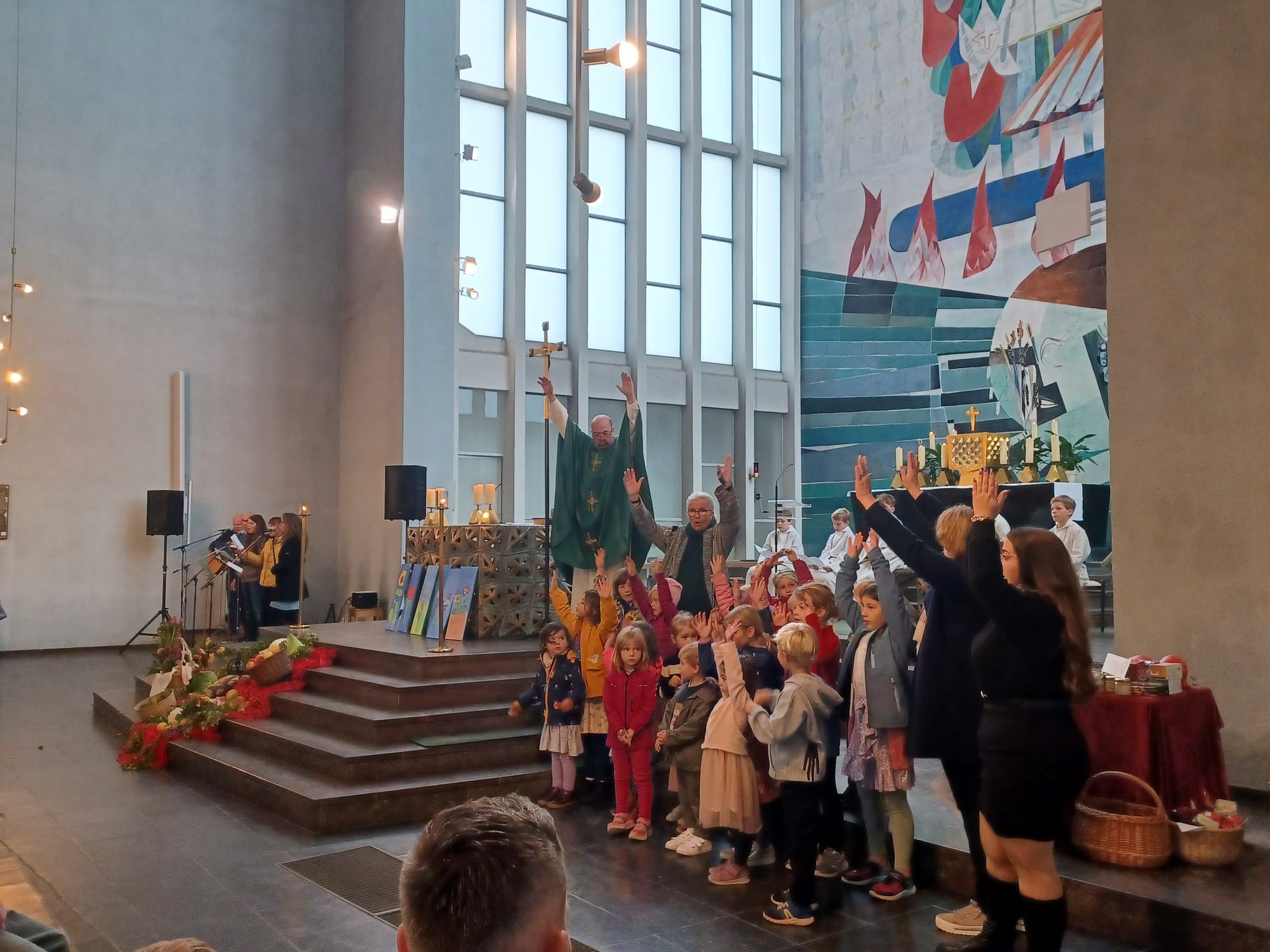 „Einfach spitze, dass du da bist …“ begrüßten Band und Eltern die vielen Kinder der KiTa St. Alfons, die mit ihren Erzieherinnen fröhlich in die Kirche einzogen, um am letzten Sonntag im September „ihren“ Gottesdienst zu feiern. Grund genug gab es. Pünktlich zum Beginn des neuen Kindergartenjahres sind die Räume der Interims-KiTa St. Alfons fertig geworden, so dass sie zum 1. September von Kindern und Erzieherinnen in Besitz genommen werden konnten. Viele Wochen und Monate der Planung und Errichtung waren nötig, um im Pfarrheim helle und freundliche Räume zu schaffen, in denen manches Mädchen und mancher Junge ihre ganze „Laufbahn“ als Kindergartenkinder verbringen werden. In der nächsten Zeit beginnen dann die Arbeiten zum Bau der neuen KiTa. Jetzt aber wurde gefeiert. Claudia von Garrel und ihr Team hatten in Zusammenarbeit mit Pfarrer Johannsen einen fröhlichen Gottesdienst für die Kinder vorbereitet, der unter dem Thema „Unsere Kita - bunt wie ein Blumenwiese“ stand. Jedes Kind brachte zum Einzug eine Blume mit, die in einem Korb mitten im Erntedankaltar gelegt wurde. Die Leiterin der Einrichtung, Claudia von Garrel, deutete mit den Kindern die Blumen und zog den Vergleich zum Leben in den Gruppen: Es gibt große und kleine, laute und leise Kinder. Jeder ist wie eine Blume, die im Kindergarten wachsen darf. Mit Bewegungsliedern und Tanz unterstrichen die Kinder die Botschaft des Gottesdienstes. Im Spiel zur Lesung, das die Kinder mit der Leiterin einstudiert hatten, wurde am Wettstreit der Blumen deutlich, dass kein Kind mehr wert oder wichtiger ist als das andere. Pfarrer Johannsen entdeckte mit den Kindern, dass alle Blütenblätter durch die Mitte verbunden sind und blühen können. Er verwies auf das Wort Jesu vom Weinstock und den Reben: „Bleibt in mir, dann bleibe ich in euch.“ Musikalisch gestaltete die Jugendband von St. Alfons den Gottesdienst.