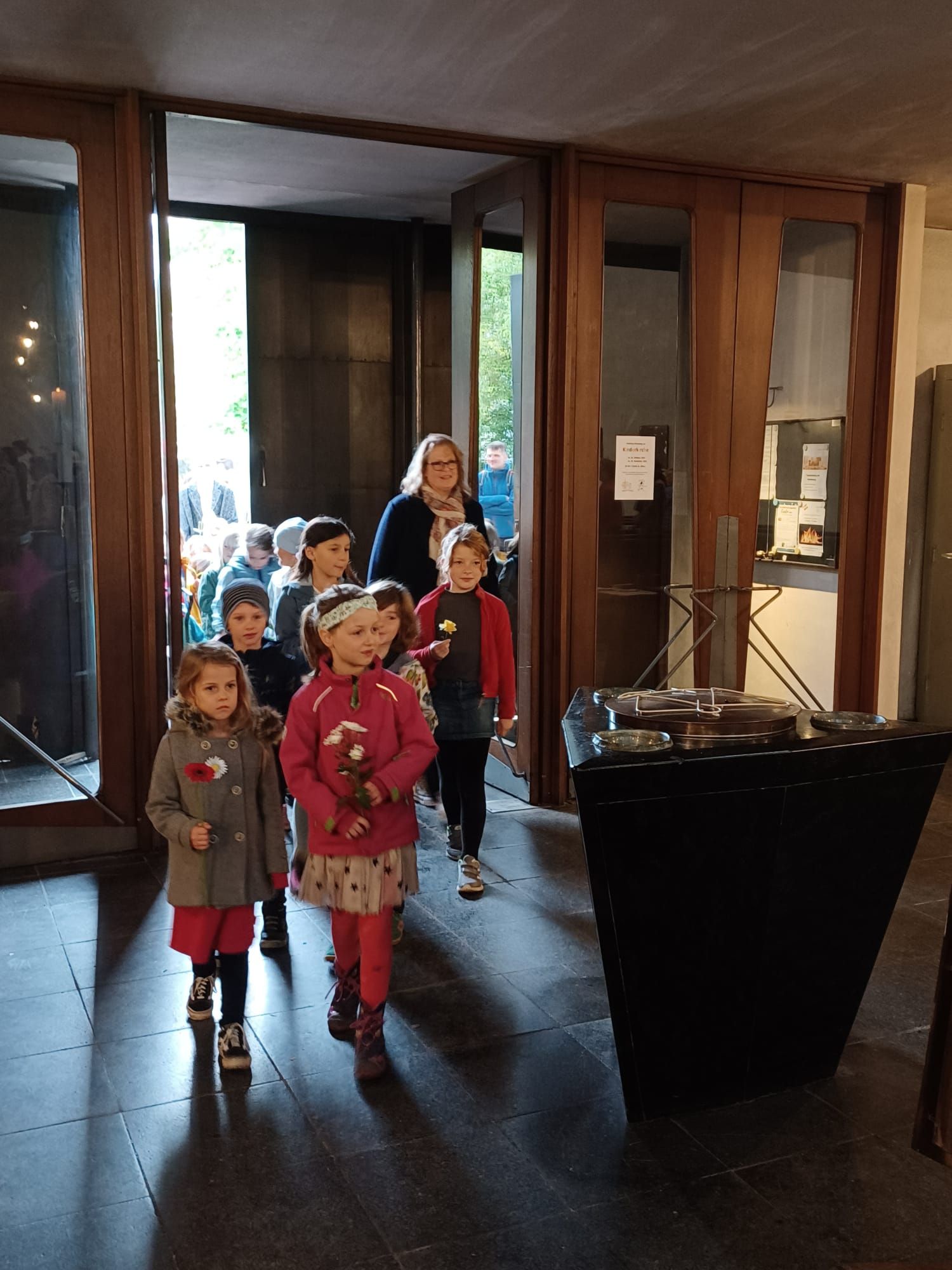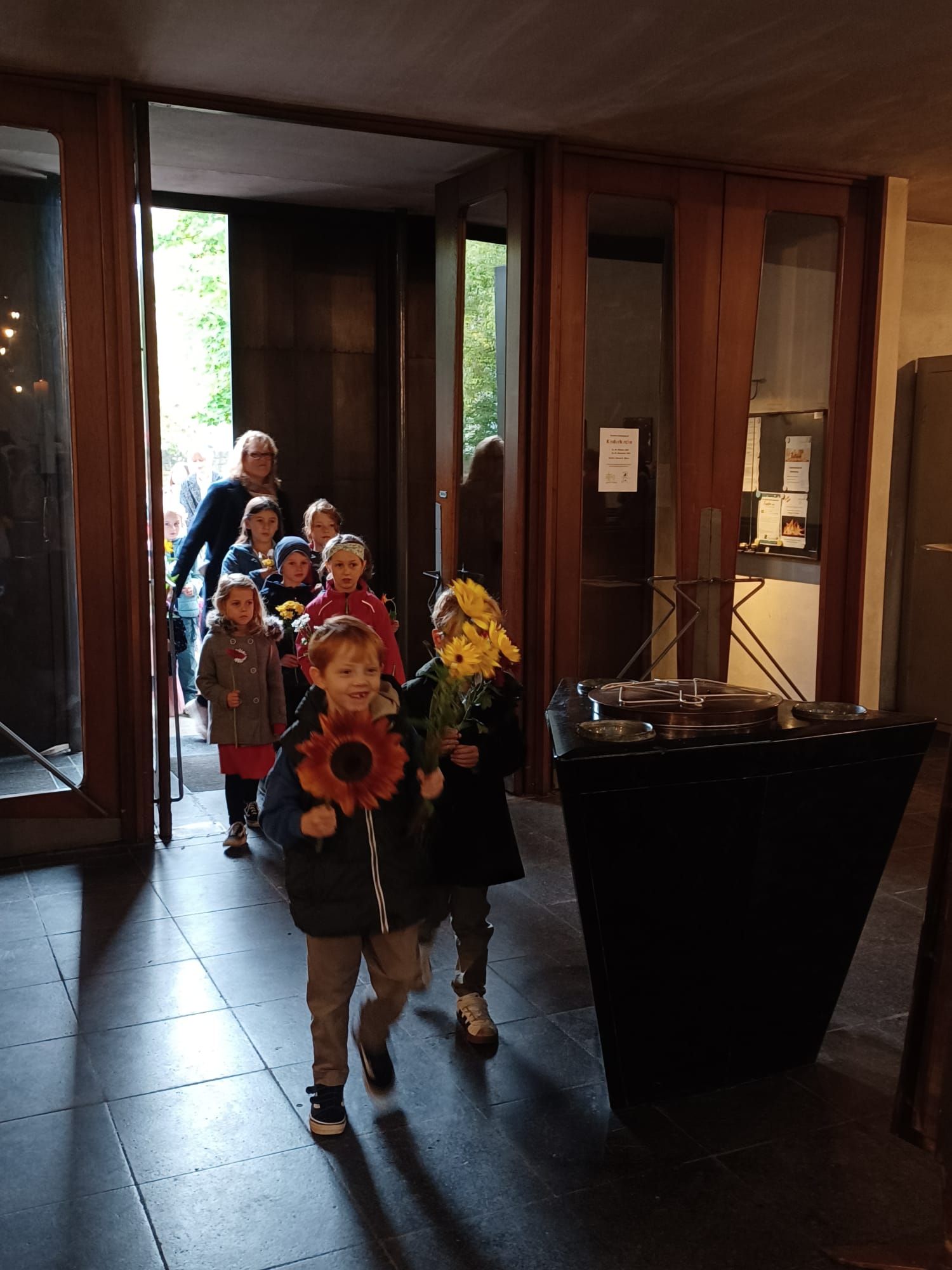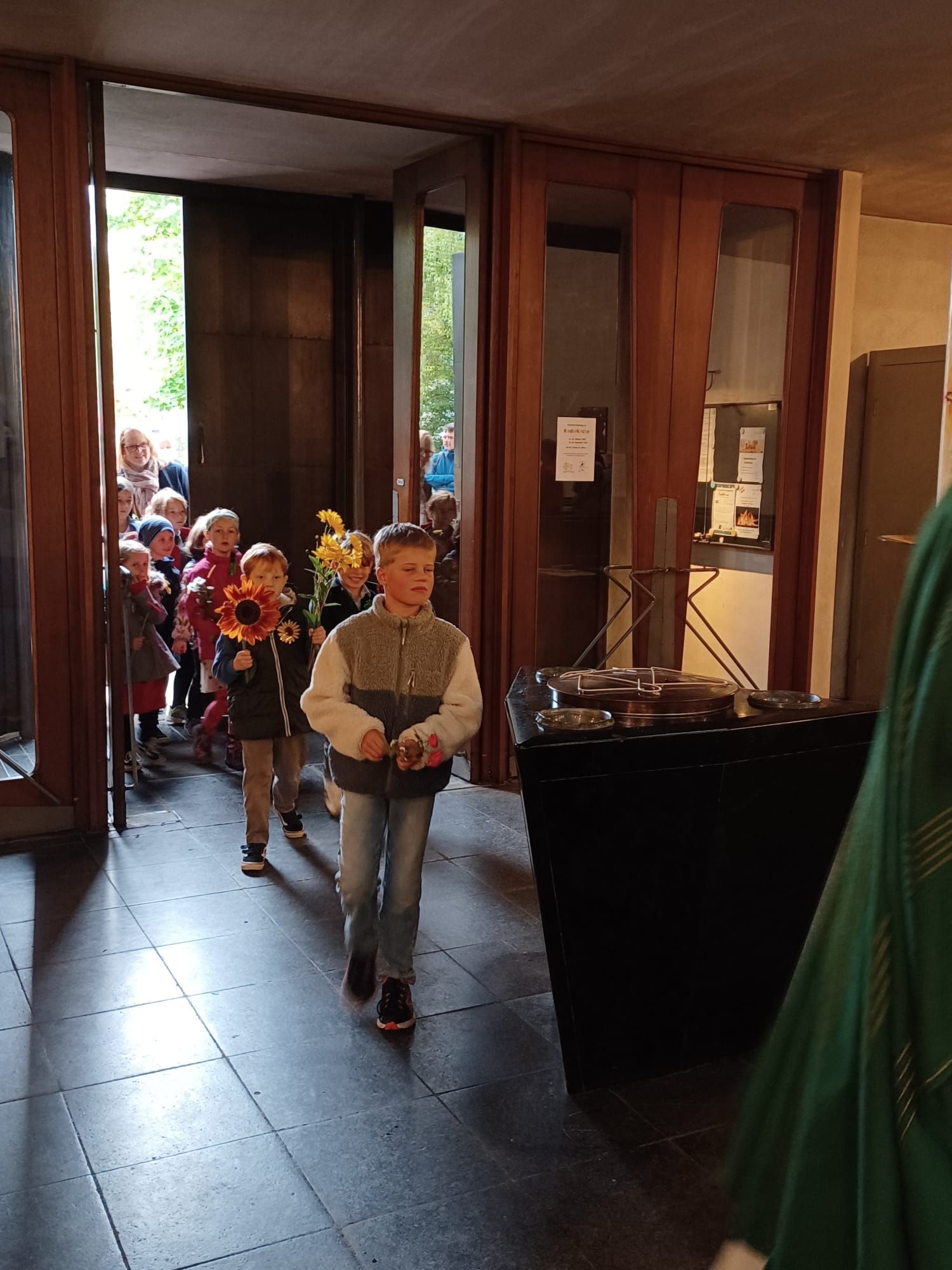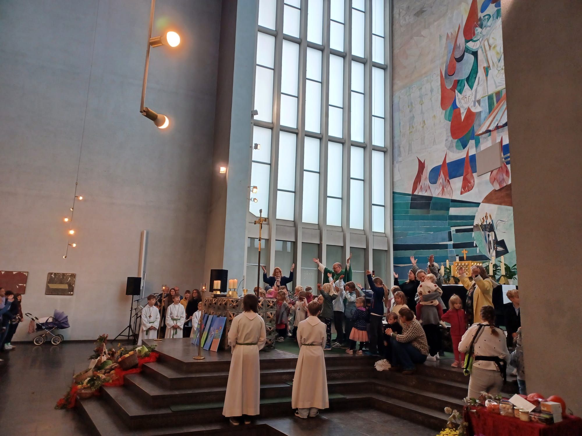 „Einfach spitze, dass du da bist …“ begrüßten Band und Eltern die vielen Kinder der KiTa St. Alfons, die mit ihren Erzieherinnen fröhlich in die Kirche einzogen, um am letzten Sonntag im September „ihren“ Gottesdienst zu feiern. Grund genug gab es. Pünktlich zum Beginn des neuen Kindergartenjahres sind die Räume der Interims-KiTa St. Alfons fertig geworden, so dass sie zum 1. September von Kindern und Erzieherinnen in Besitz genommen werden konnten. Viele Wochen und Monate der Planung und Errichtung waren nötig, um im Pfarrheim helle und freundliche Räume zu schaffen, in denen manches Mädchen und mancher Junge ihre ganze „Laufbahn“ als Kindergartenkinder verbringen werden. In der nächsten Zeit beginnen dann die Arbeiten zum Bau der neuen KiTa. Jetzt aber wurde gefeiert. Claudia von Garrel und ihr Team hatten in Zusammenarbeit mit Pfarrer Johannsen einen fröhlichen Gottesdienst für die Kinder vorbereitet, der unter dem Thema „Unsere Kita - bunt wie ein Blumenwiese“ stand. Jedes Kind brachte zum Einzug eine Blume mit, die in einem Korb mitten im Erntedankaltar gelegt wurde. Die Leiterin der Einrichtung, Claudia von Garrel, deutete mit den Kindern die Blumen und zog den Vergleich zum Leben in den Gruppen: Es gibt große und kleine, laute und leise Kinder. Jeder ist wie eine Blume, die im Kindergarten wachsen darf. Mit Bewegungsliedern und Tanz unterstrichen die Kinder die Botschaft des Gottesdienstes. Im Spiel zur Lesung, das die Kinder mit der Leiterin einstudiert hatten, wurde am Wettstreit der Blumen deutlich, dass kein Kind mehr wert oder wichtiger ist als das andere. Pfarrer Johannsen entdeckte mit den Kindern, dass alle Blütenblätter durch die Mitte verbunden sind und blühen können. Er verwies auf das Wort Jesu vom Weinstock und den Reben: „Bleibt in mir, dann bleibe ich in euch.“ Musikalisch gestaltete die Jugendband von St. Alfons den Gottesdienst.