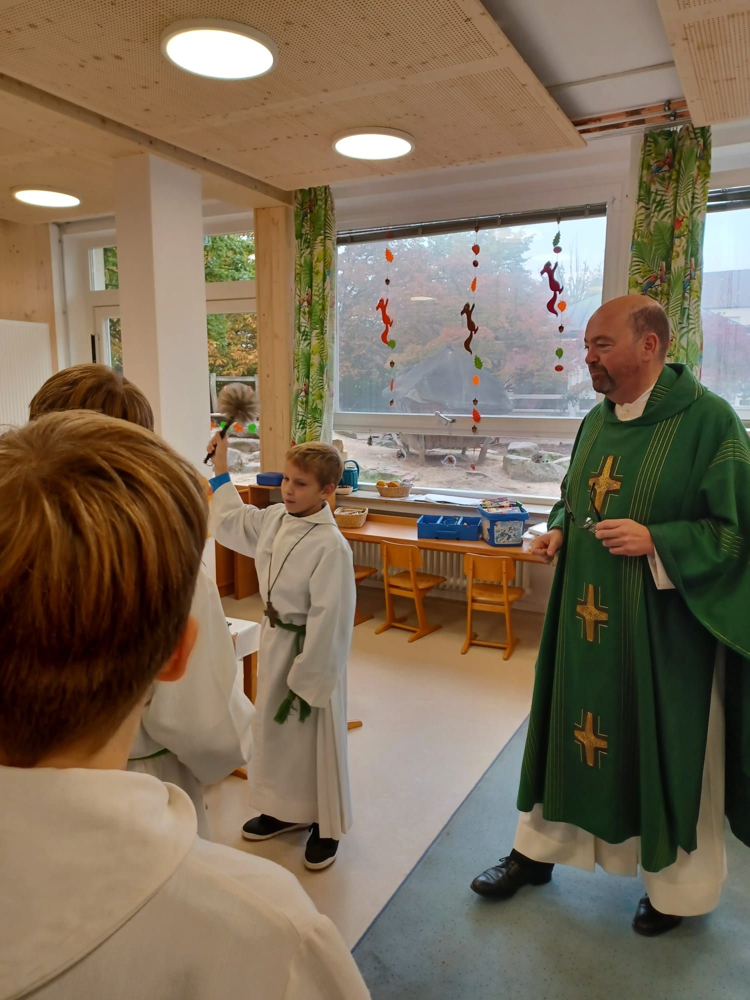 Berührend war der Moment des Segens. Die Eltern spannten zum Segenslied „Gott, dein guter Segen“ ein weites Schwungtuch über die Kinder und geleiteten sie so von der Kirche zur neuen Kita. Dort segnete der Pfarrer mit Kindern und Ministranten die neue Räumen. Der Elternbeirat lud bei schönstem Wetter zu Kaffee und Kuchen ein, so dass viele jüngere und ältere Besucher noch schöne Stunden auf dem Platz vor der KiTa verbringen konnten. Viel Anerkennung erfuhrt die helle und freundliche Gestaltung der Räume und des Foyers.