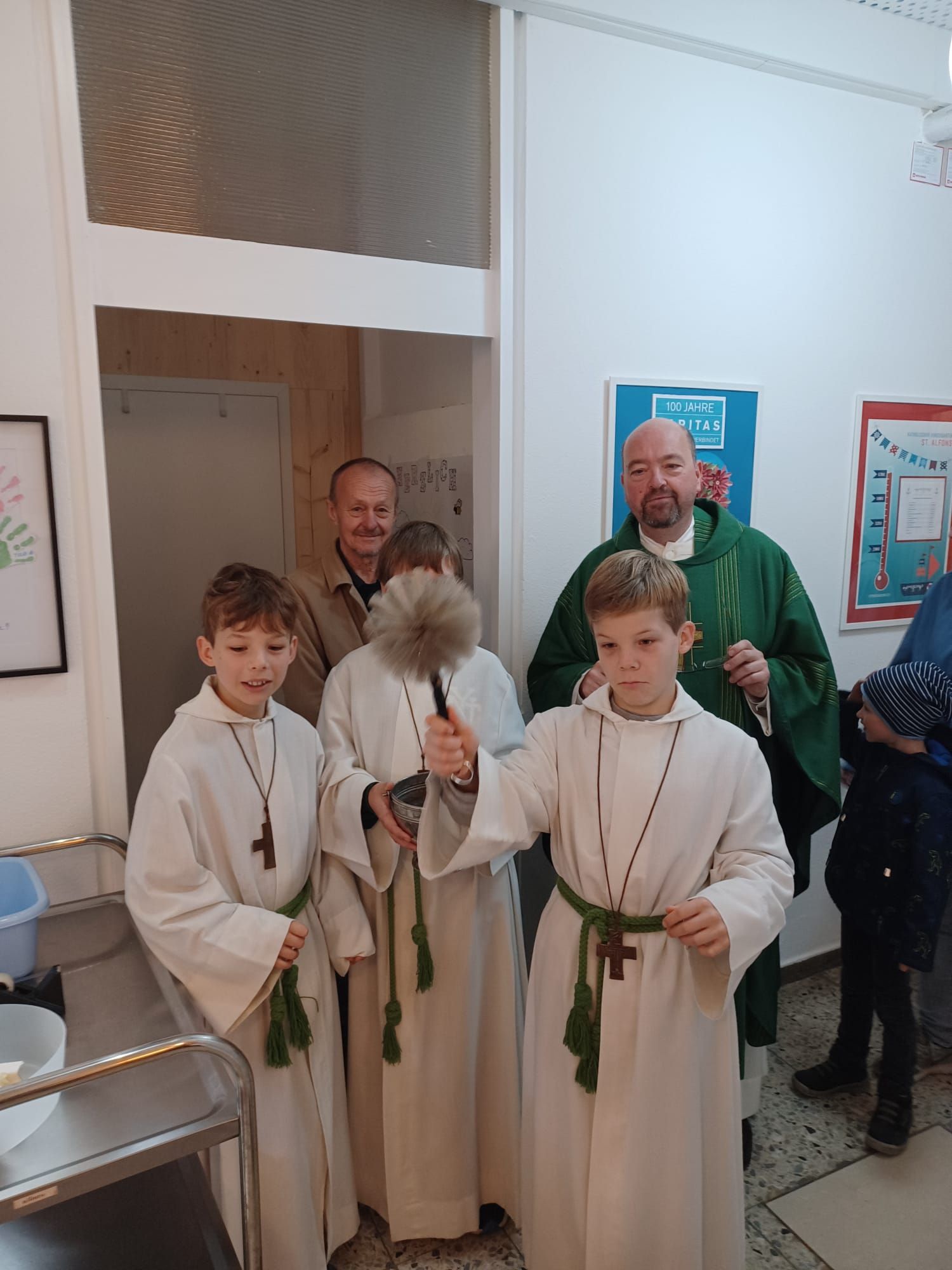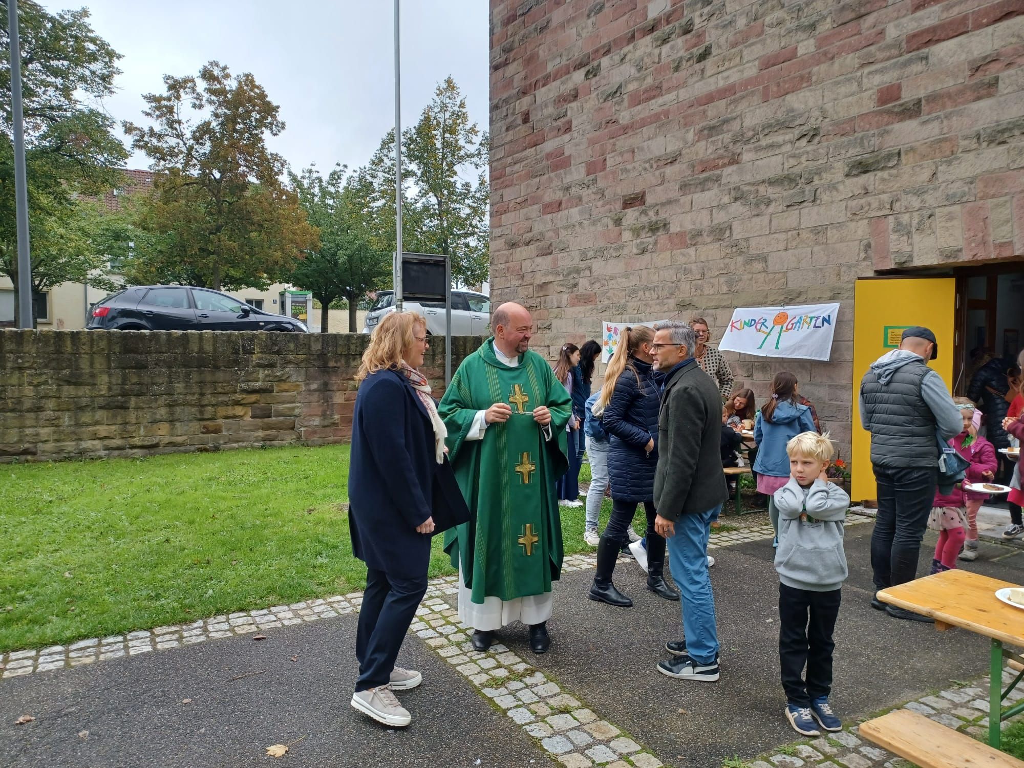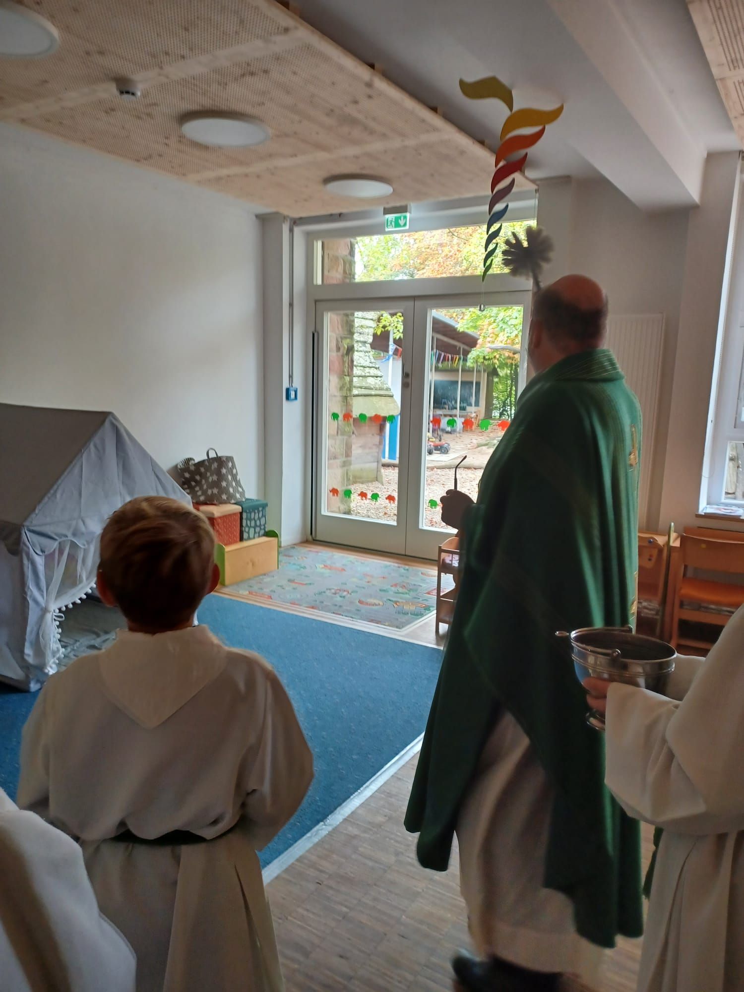 Am Ende des Gottesdienstes bedankte sich Cornell Schmeisser für die Kirchenverwaltung beim Team des Kindergarten, das in den vergangenen Wochen die zusätzliche Belastung bewundernswert gemeistert hat. Besonders dem Engagement von Frau von Garrel und von Herrn Wellhöfer aus der Kirchenverwaltung ist es zu verdanken, dass die Räumen pünktlich bezogen werden konnten. Dafür allen Engagierten ein herzliches Vergelt's Gott.