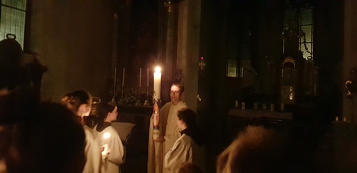 Die Osternacht fand in diesem Jahr am Samstagabend um 20 Uhr statt. Einzig allein das Osterfeuer brannte vor der Kirche. Gemeinsam mit einer Schar von Ministranten zog Pater Martin mit der neuentzündeten Osterkerze in die Kirche. Wir feierten einen festlichen Gottesdienst - der "Auferstandene" - schmückte den rechten Seitenaltar. Mitgestaltet wurde der Gottesdienst vom Chor Sinnfonie, der mit österlichen Gesängen den Gottesdienst begleitete und die Festlichkeit mit dem Gesang zum Ausdruck brachte. Pater Martin bedankte sich zum Schluss bei allen, die den Gottesdienst vorbereitet und mitgestaltet hatten. Besonders die Ministranten, die mit großem Eifer seit Karfreitagmorgen unterwegs waren.