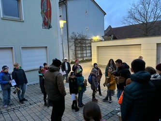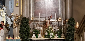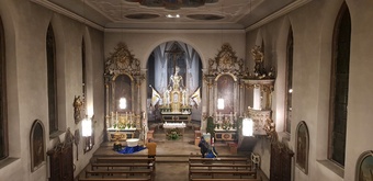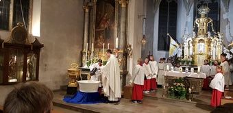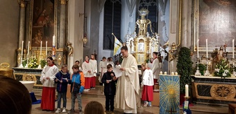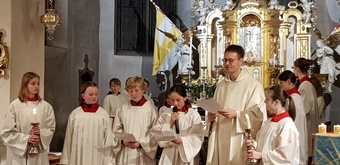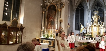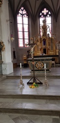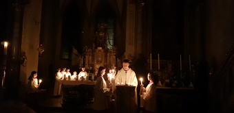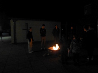 Die Osternacht fand in diesem Jahr am Samstagabend um 20 Uhr statt. Einzig allein das Osterfeuer brannte vor der Kirche. Gemeinsam mit einer Schar von Ministranten zog Pater Martin mit der neuentzündeten Osterkerze in die Kirche. Wir feierten einen festlichen Gottesdienst - der "Auferstandene" - schmückte den rechten Seitenaltar. Mitgestaltet wurde der Gottesdienst vom Chor Sinnfonie, der mit österlichen Gesängen den Gottesdienst begleitete und die Festlichkeit mit dem Gesang zum Ausdruck brachte. Pater Martin bedankte sich zum Schluss bei allen, die den Gottesdienst vorbereitet und mitgestaltet hatten. Besonders die Ministranten, die mit großem Eifer seit Karfreitagmorgen unterwegs waren.