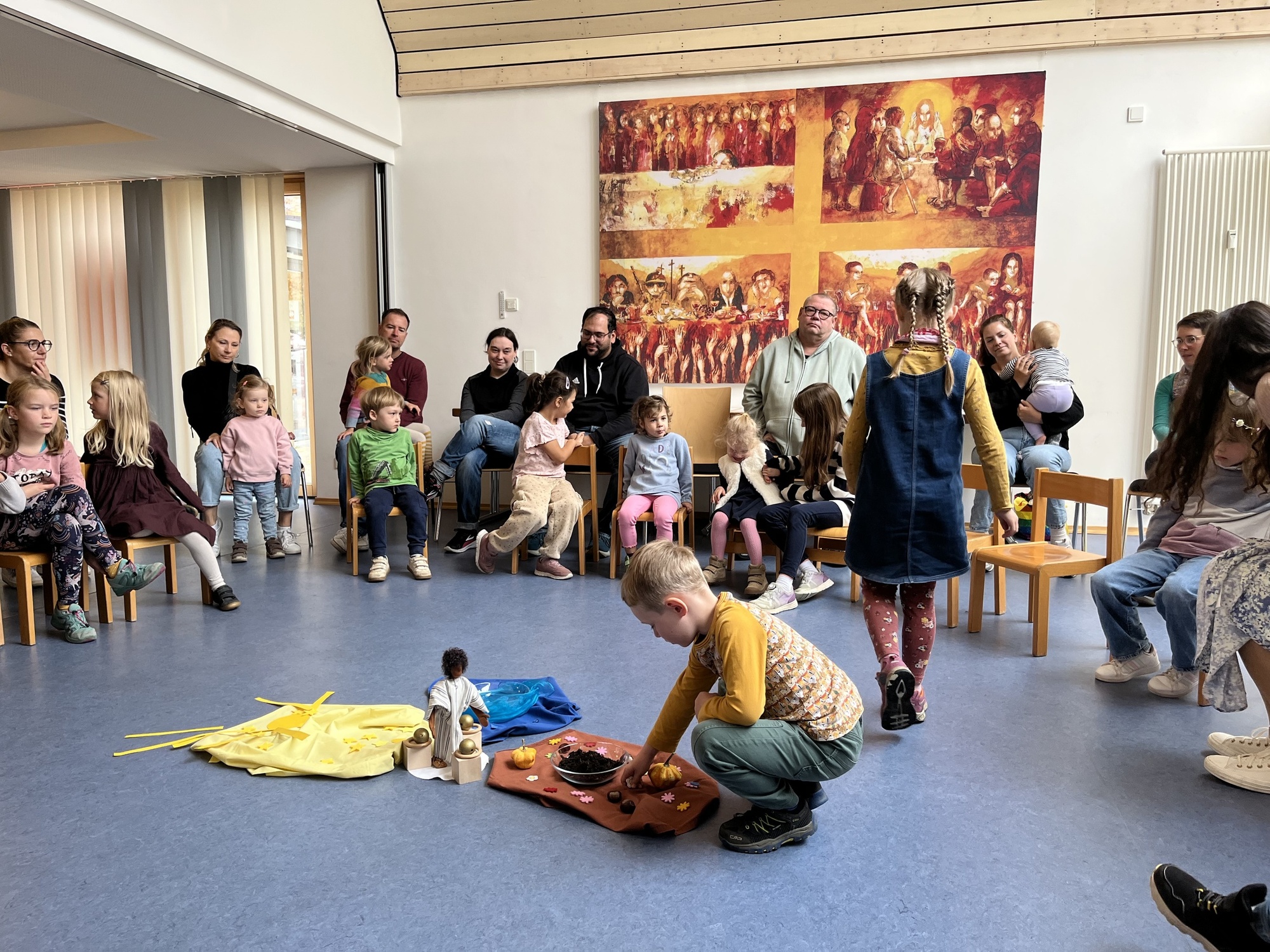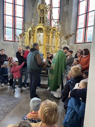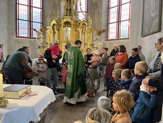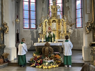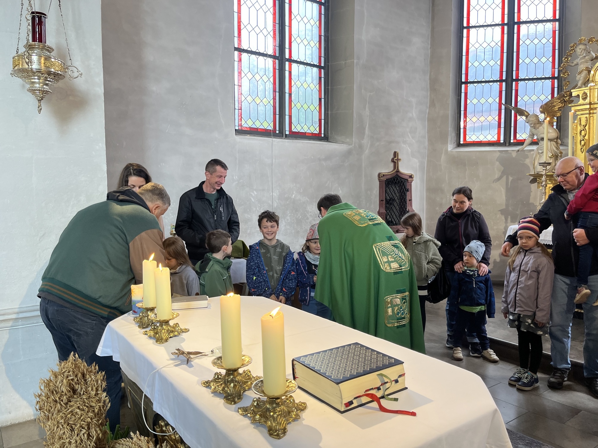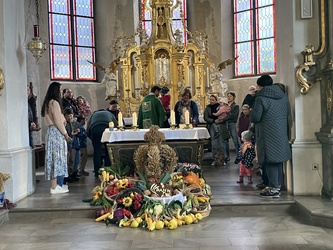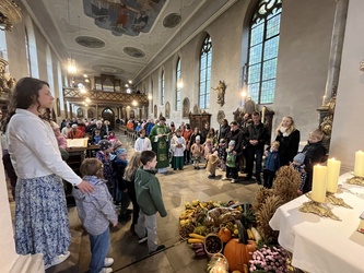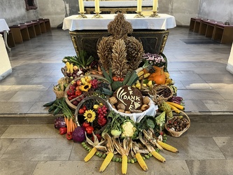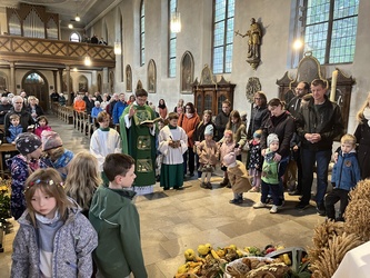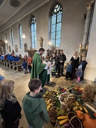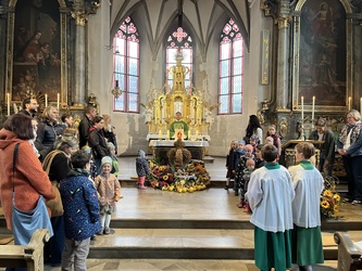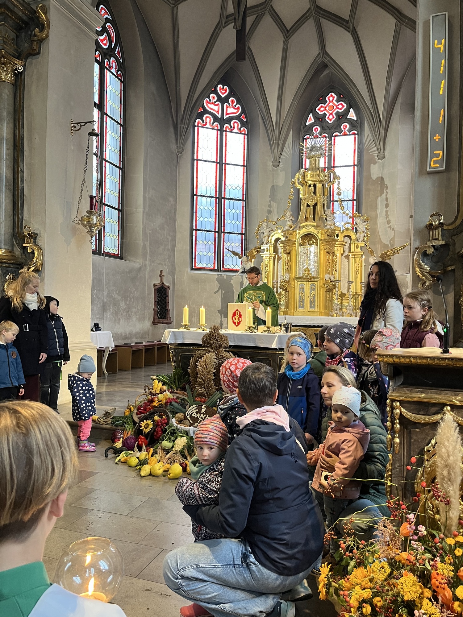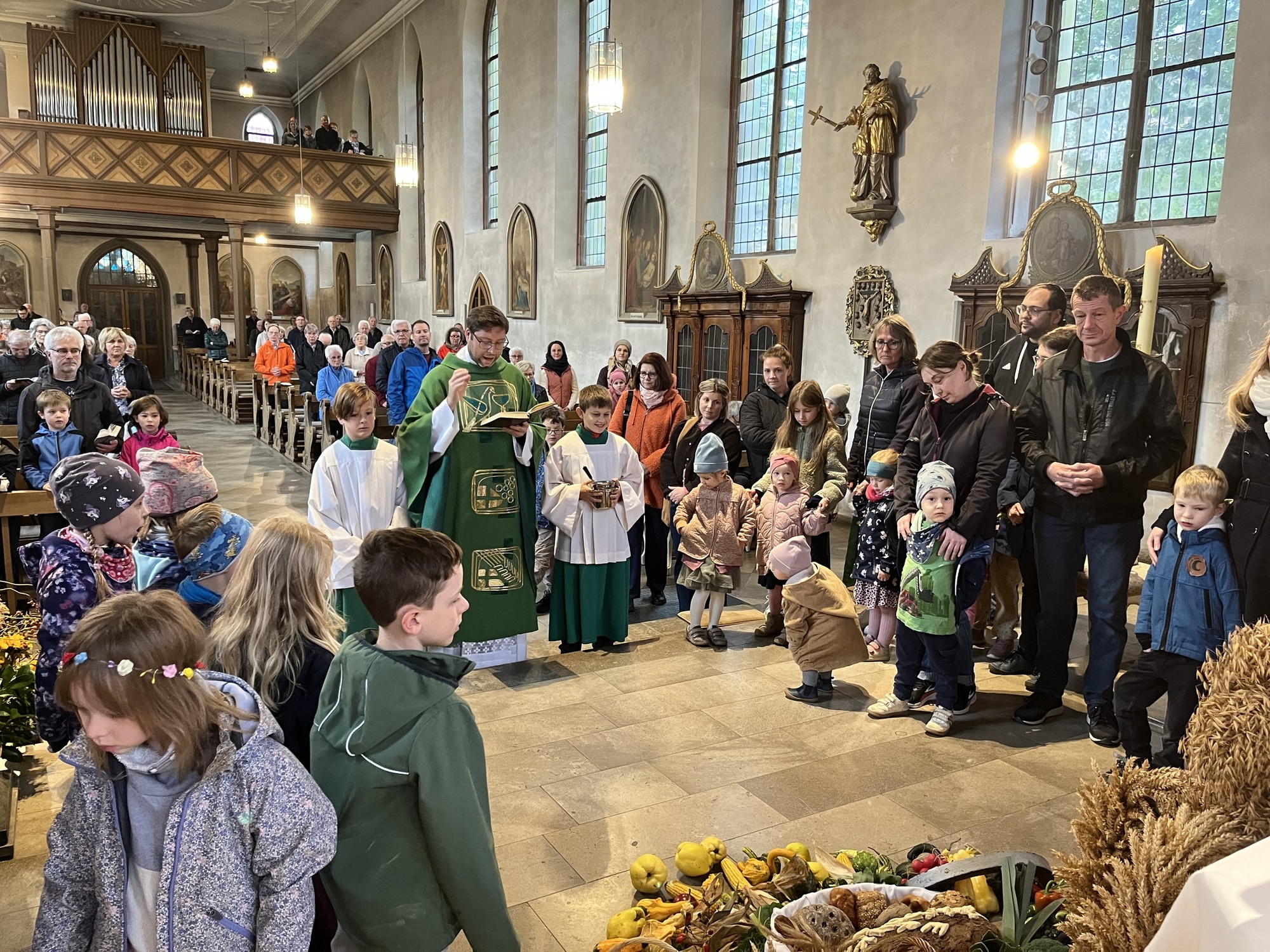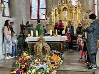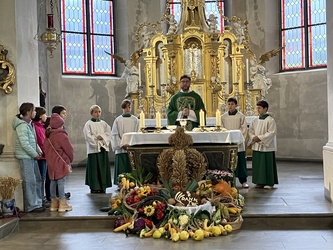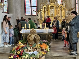 Am Sonntag, 5.10.25 zog eine große Schar von Kindern und Familien mit in den Gottesdienst ein. Sie brachten, jeder noch ein Stück Obst und Gemüse nach vorne zum wunderbar gestalteten Erntealtar. Manuel Thomas begrüßte die große Gemeinde und segnete die Erntegaben. Die Kinder feierten mit den Familien ihren eigenen Erntedankgottesdienst im Pfarrzentrum. Thematisch beschäftigten sie sich mit Franz von Assisi und hörten und legten den Sonnengesang.