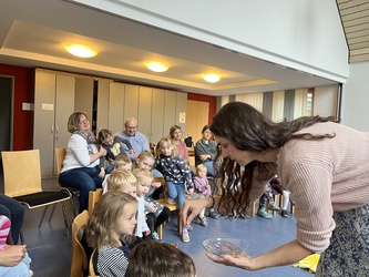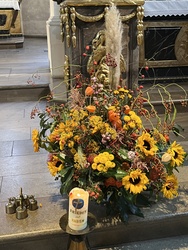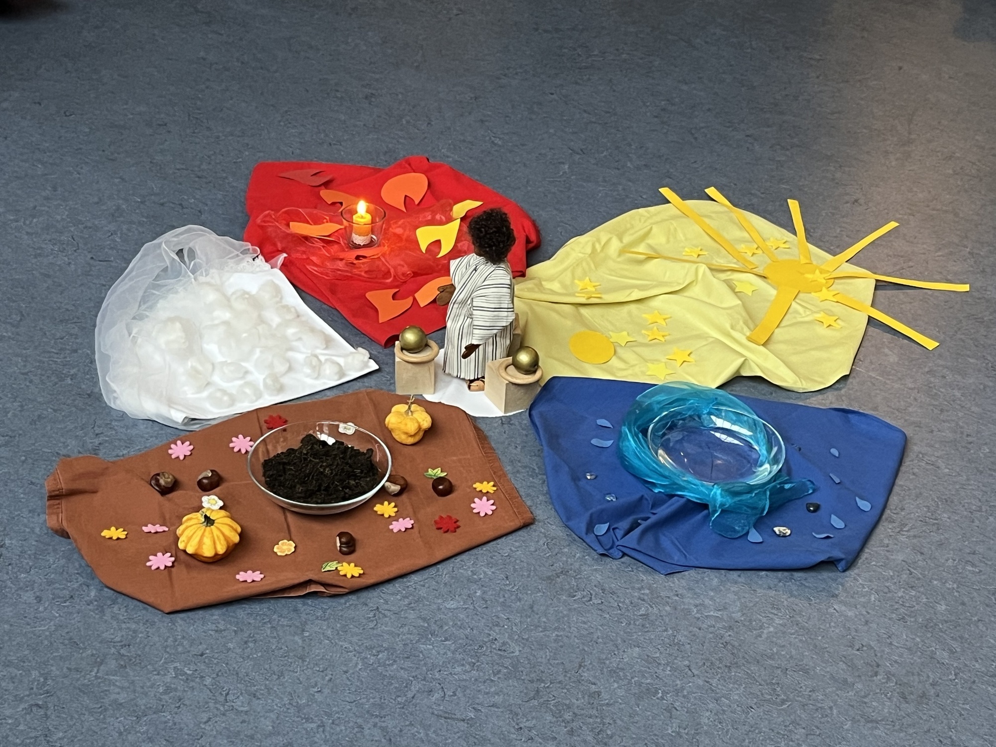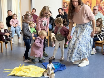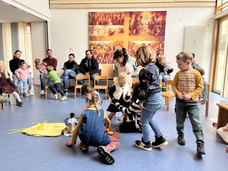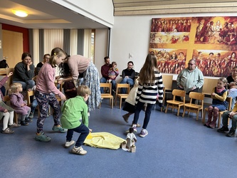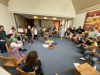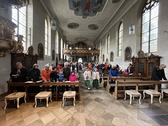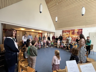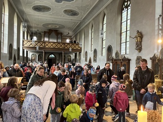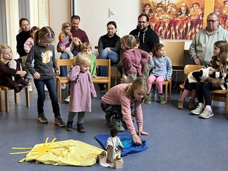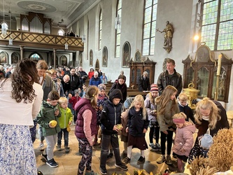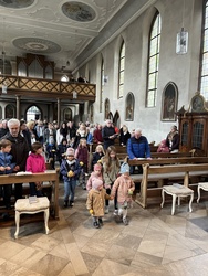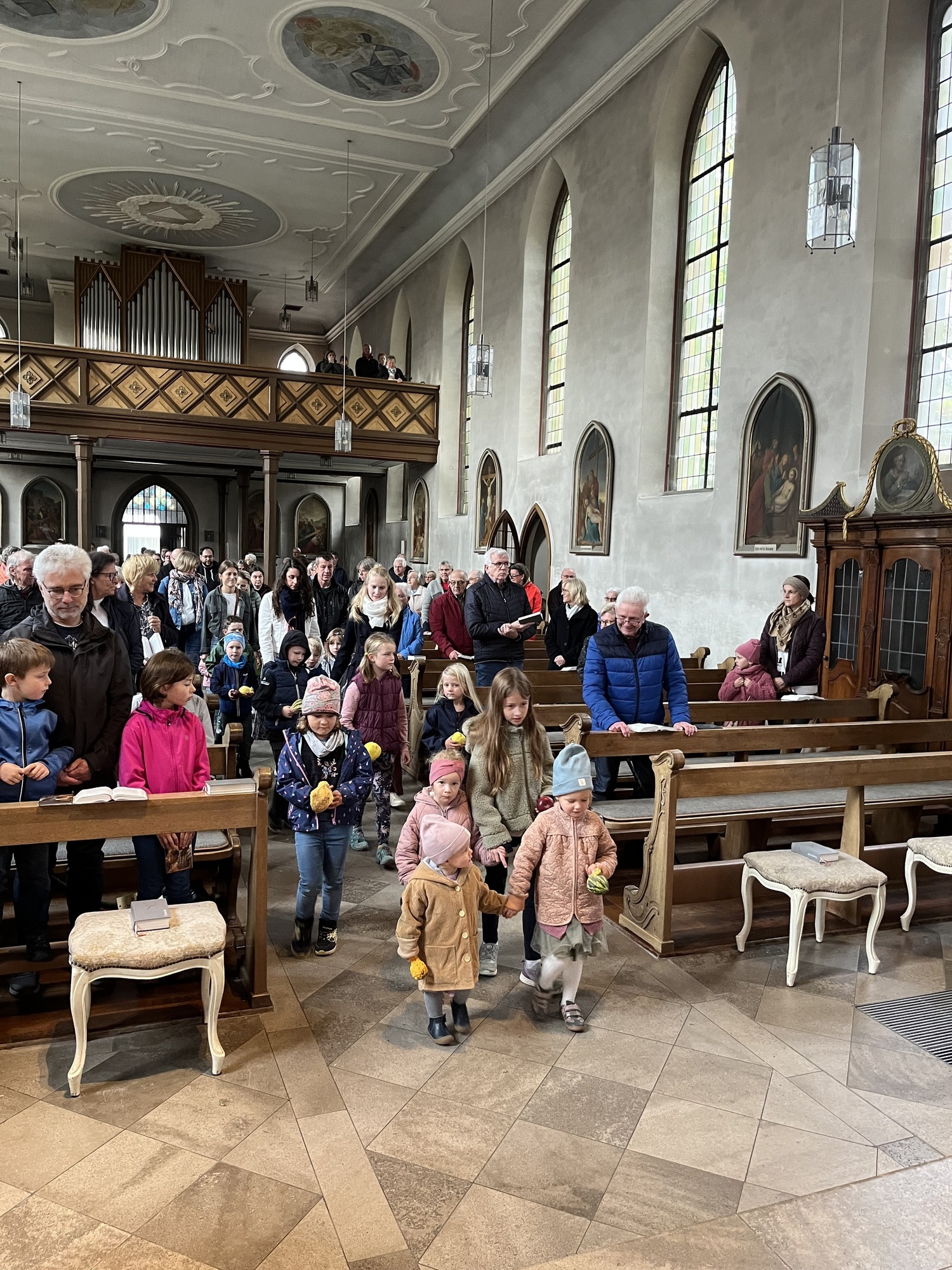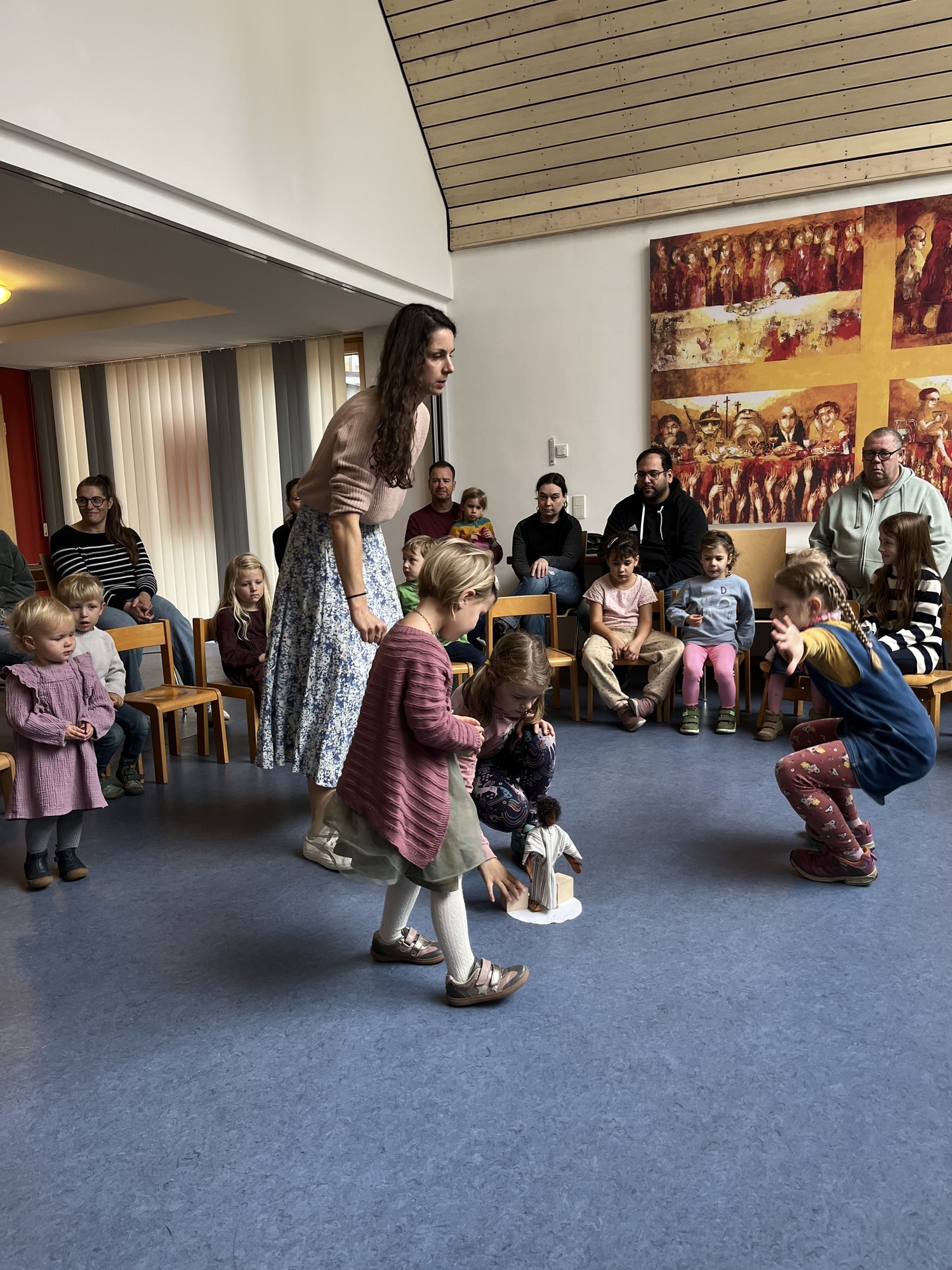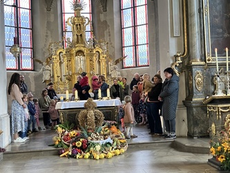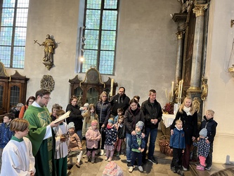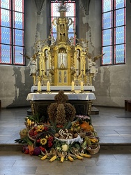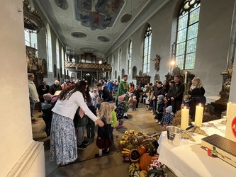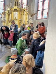 Am Sonntag, 5.10.25 zog eine große Schar von Kindern und Familien mit in den Gottesdienst ein. Sie brachten, jeder noch ein Stück Obst und Gemüse nach vorne zum wunderbar gestalteten Erntealtar. Manuel Thomas begrüßte die große Gemeinde und segnete die Erntegaben. Die Kinder feierten mit den Familien ihren eigenen Erntedankgottesdienst im Pfarrzentrum. Thematisch beschäftigten sie sich mit Franz von Assisi und hörten und legten den Sonnengesang.