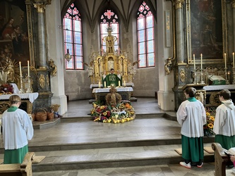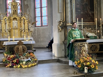 Zum Segen trafen sich alle wieder in der Pfarrkirche. Traditionell hatte der Obst- und Gartenbauverein für jedes Kind einen roten saftigen Apfel mitgebracht. Manuel Thomas stellte noch das neue Blumenteam vor: Elisabeth Bäumel, Katharina Hain, Fiona Killinger und Brigitte Mautner. Sie sorgen dafür, dass unsere Kirche stets schön geschmückt ist und zeigten ihre Kreativität bereits bei den Erntegaben. Vielen Dank dafür!