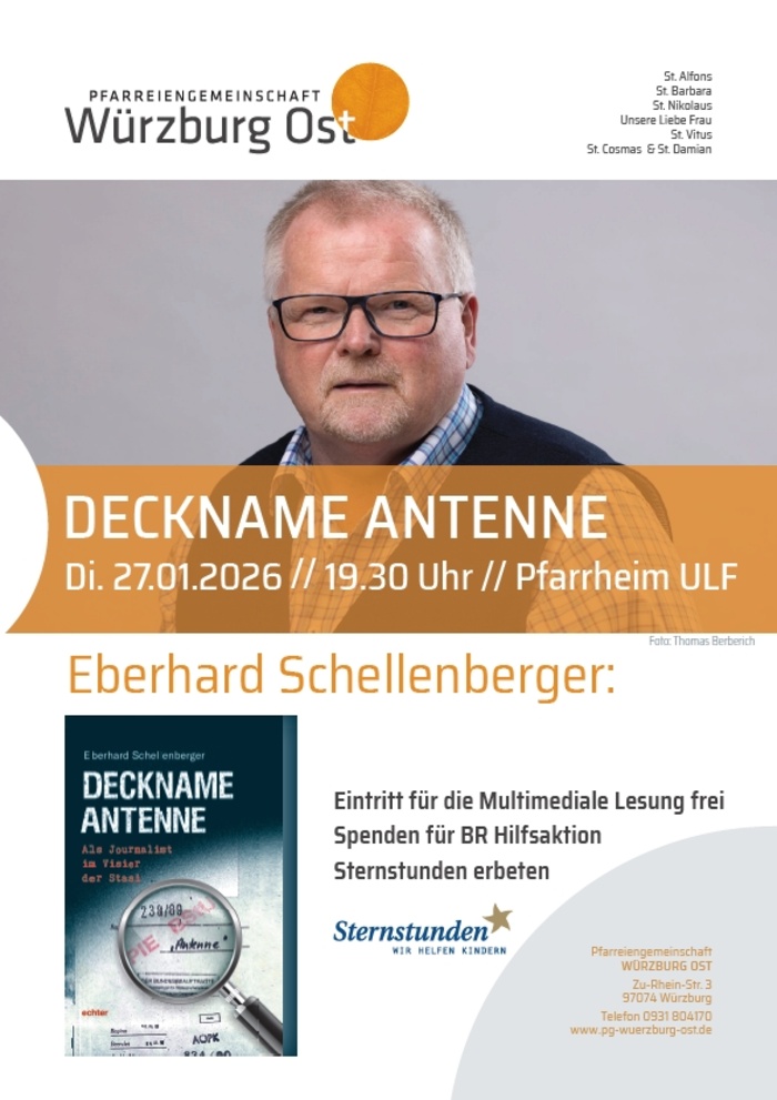 Das deutsch-deutsche Zusammenleben begleitete den Würzburger Journalisten Eberhard Schellenberger, Jahrgang 1957, privat und als langjährigen BR-Reporter ein ganzes Leben lang und wurde zu seinem journalistischen "Lebensthema". Schon bei seiner ersten, privaten Einreise in die DDR 1984 legte die Stasi eine Akte von am Ende 400 Seiten über ihn an. Eng überwacht wurde er vor allem im Zuge der Verhandlungen zur Städtepartnerschaft Würzburg- Suhl. Daraus hat der Journalist das Buch „Deckname Antenne“ gemacht, das im Würzburger Echter Verlag erschienen ist. Eberhard Schellenberger bietet einen multimedialen Ausflug mit Geschichten, Bildern, Tönen und Videos in die deutsch-deutsche Vergangenheit. Über 35 Jahre nach Mauerfall (1989) und Wiedervereinigung (1990).