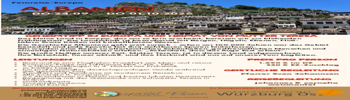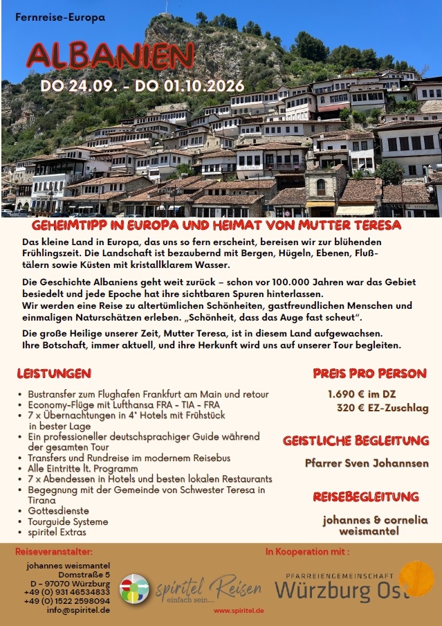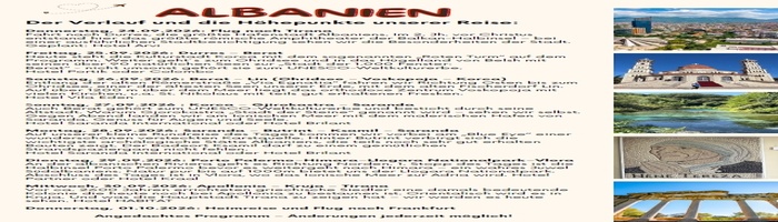 Albanien ist ein Land mit einer langen Geschichte. Viele Kulturen, Religionen und Völker haben ihre Spuren hinterlassen. Für uns ist v.a. Mutter Teresa das berühmteste Kind des Landes. Noch ist Albanien touristisch in den Kinderschuhen. Herzlich laden wir ein zu einem ersten Informationstreffen in den Sakristeisaal von ULF.