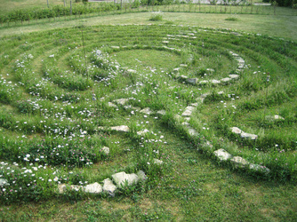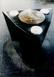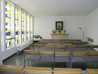 Die "Sockelzone" um den Altar, in Grün gehalten, ist als Erdzone zu verstehen. Ein Kreis, der Erdball, mit den eucharistischen Symbolen von Ähre und Rebe betont den Altar.