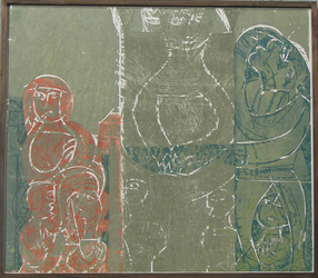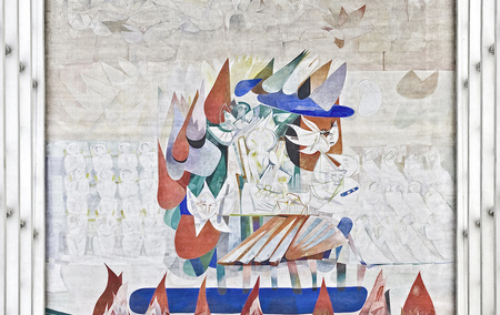 Das etwa 10 x 20 Meter große Altarbild malte Georg Meistermann (1911-1990) zusammen mit zwei Schülern von Anfang Juli bis Mitte September 1954 auf den trockenen Putz ("al secco").